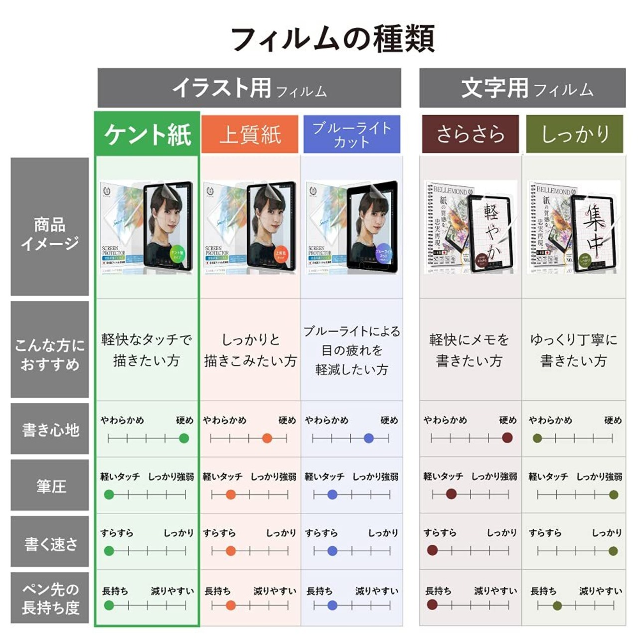 【ケント紙タイプの特徴】:ケント紙のようにツルツルとした描き心地のフィルムです。筆圧弱め、サラサラとしたタッチでイラストやメモ書きをしたい方に。【他タイプとの違い】:ザラザラとした描き心地、強い筆圧でしっかりと描きたい方は上質紙タイプをご検討ください。