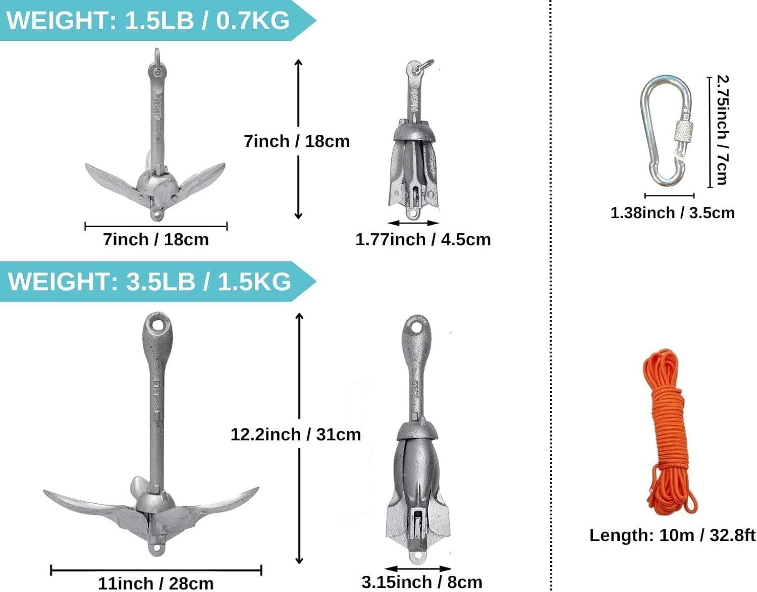 BeGrit カヤックアンカー セットボートアンカー0.7/1.5KG 船用アンカー 折り畳み アンカー 6mm 10m アンカー牽引ロープ 小型ボート SUP 浅湖 釣り アンカーキット アルミDリング ブイボール 収納袋付き