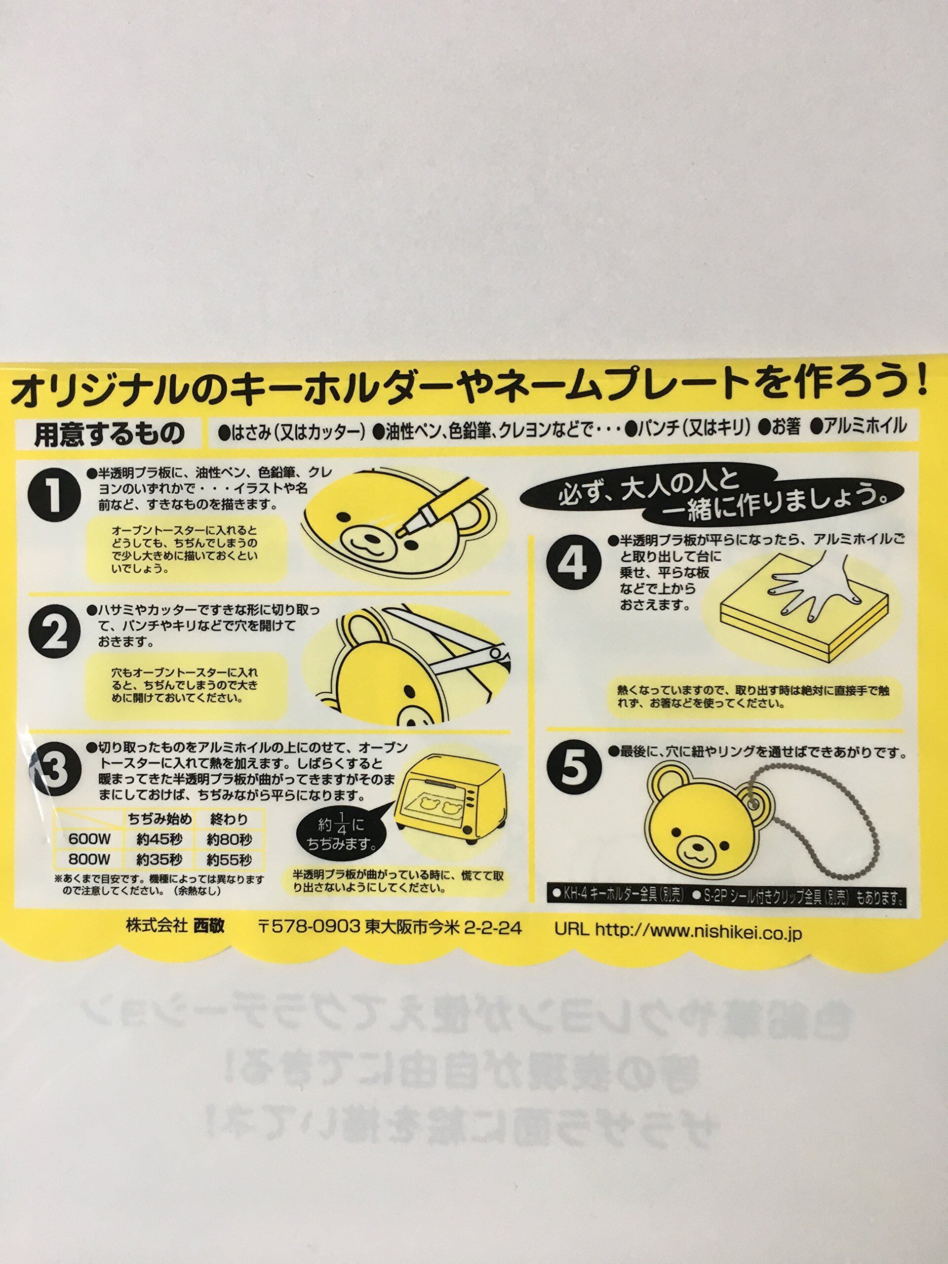 オーブントースターに入れて焼くことで約1/4に縮みます。プリントアウトした下絵などを使って、自分だけのオリジナルキーホルダーやアクセサリーが作れる!ハンドメイドなどをされている女性のお客様にも好評です。予め加工してあるので、油性を含め、色鉛筆・クレヨン・クレパスなどが使えます。