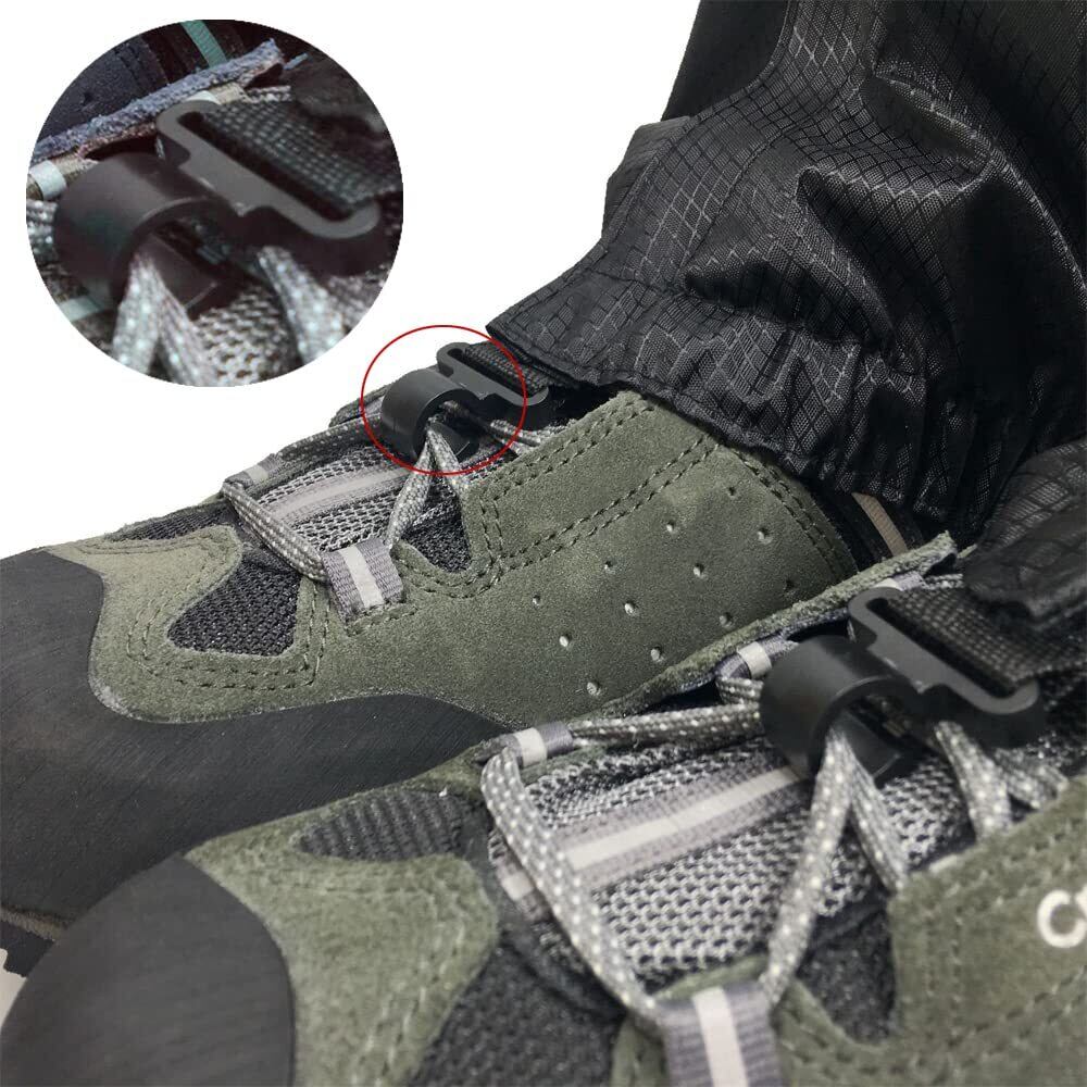 【伸縮性】:ゲイター下部のフックは靴紐に引っ掛けます。ストラップはシューズ底のアーチ部分を通します。バックル部分で長さ調節でき、伸縮性がありますので、しっかりフィットします。