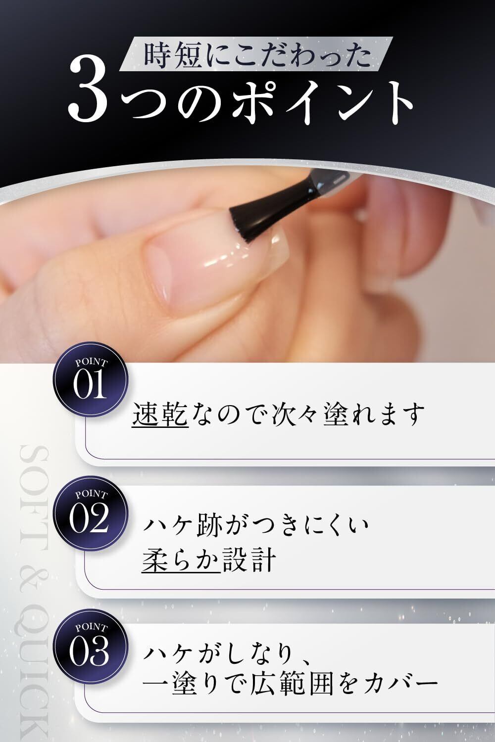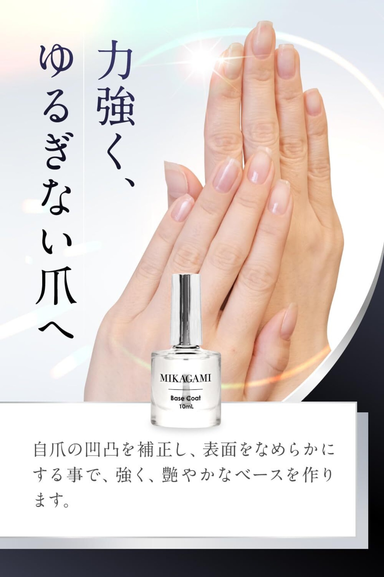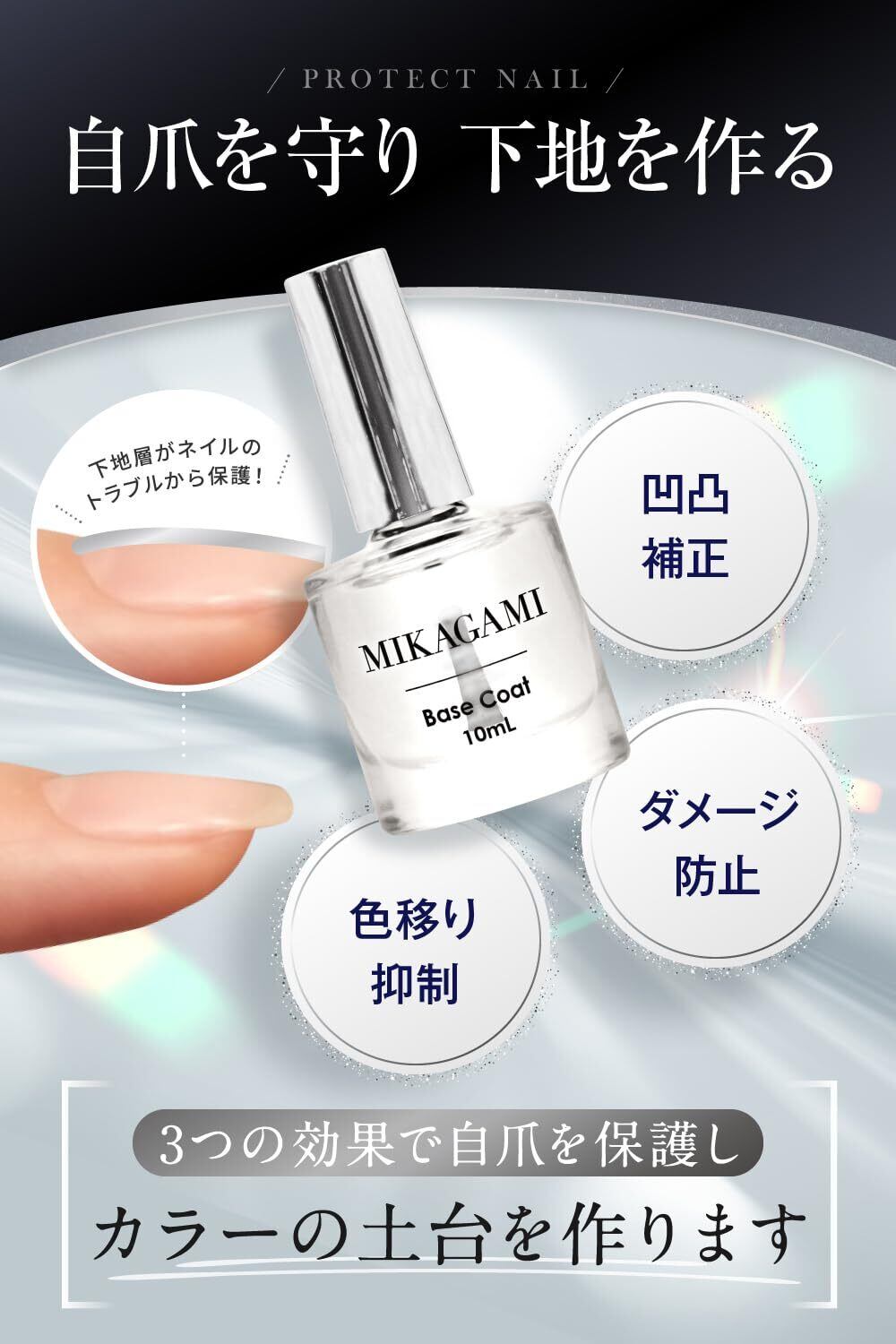 【自爪を守る下地作り】自爪へのダメージを防ぎ、爪の凹凸を補正し、滑らかにします。