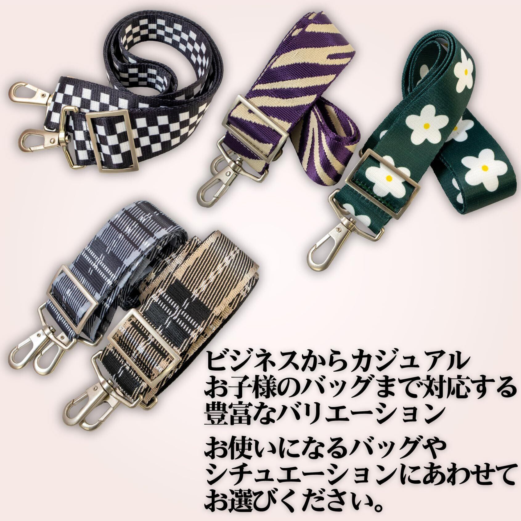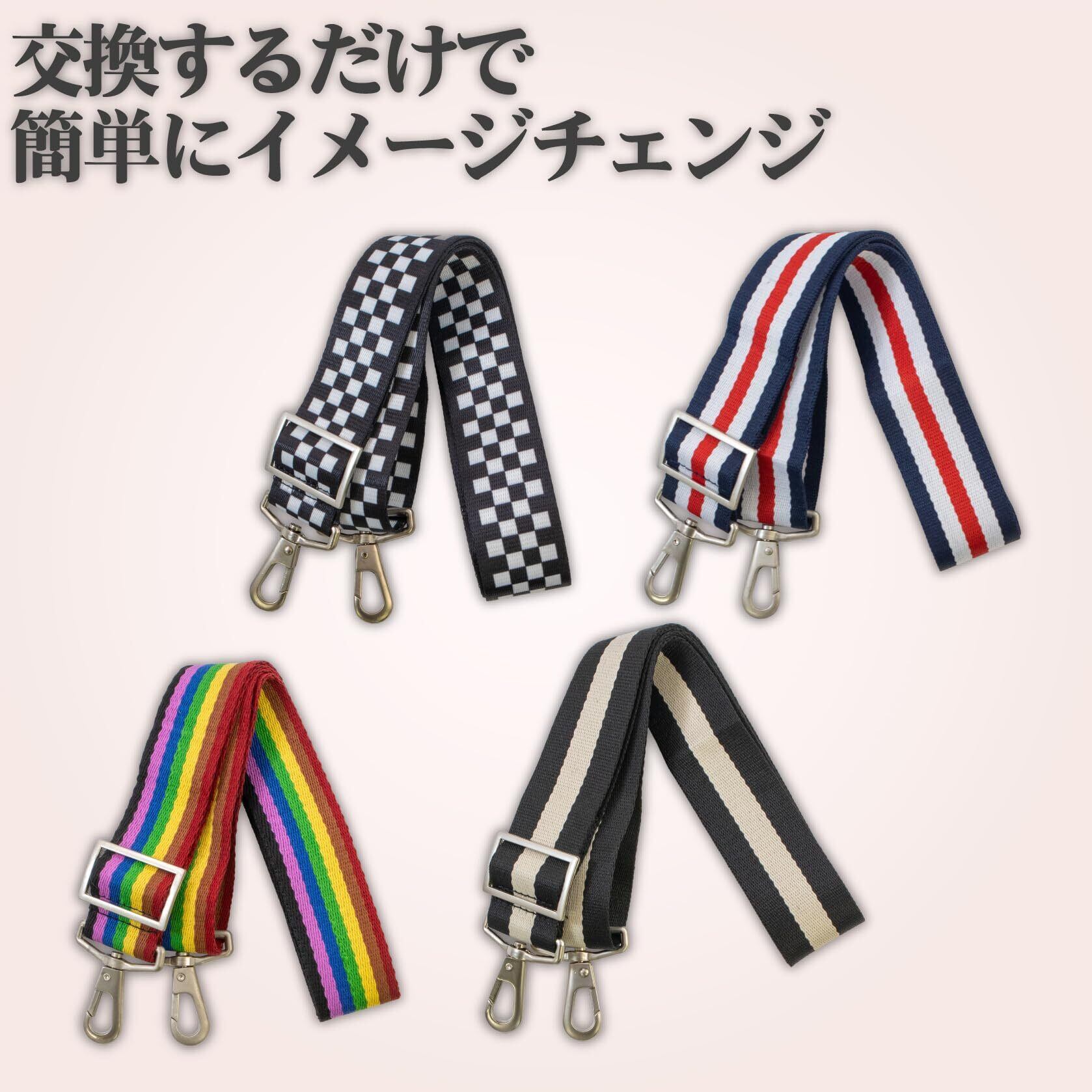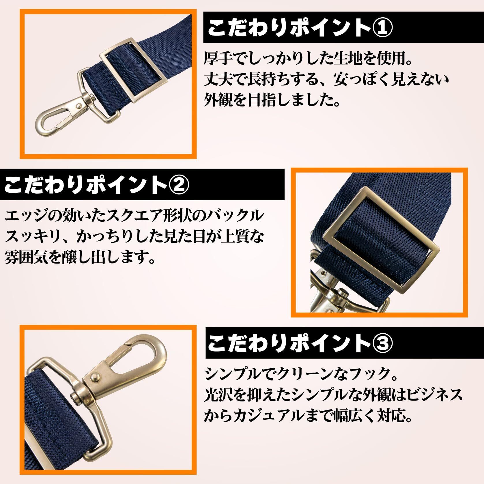 特徴:1、幅広で食い込みにくく、肩の負担を軽減。2、フックやバックルは金属パーツを使用。上質感のあるつや消し塗装。3、手触りの良い滑らかな生地。(柄物などは一部質感が異なります。)4、カチッとはめるだけ。手軽にイメージチェンジが可能。5、ビジネスからカジュアルまで、用途に応じて選べるカラーバリエーション。