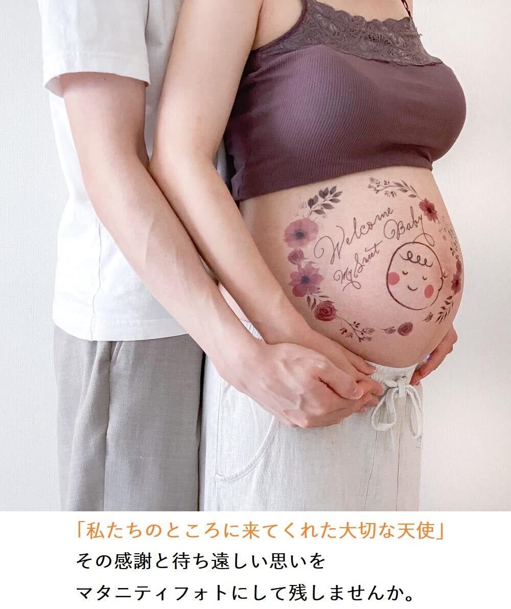貼り付けに時間がかからず簡単にマタニティフォトが撮影できます。 落とすのも簡単で時間はかかりません。 ボディペイントよりも早く簡単に利用することができます。
