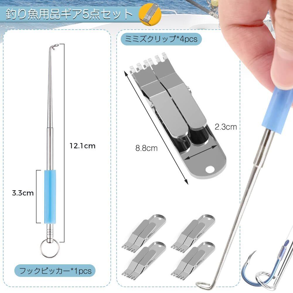 セット内容:釣り魚用品ギア5点セット(ミミズクリップ*4pcs+ステンレス製フックピッカー1pcs);人間工学に基づいたデザインは、プロセスを簡素化し、時間を節約し、手を保護し、魚へのダメージを最小限に抑えます。