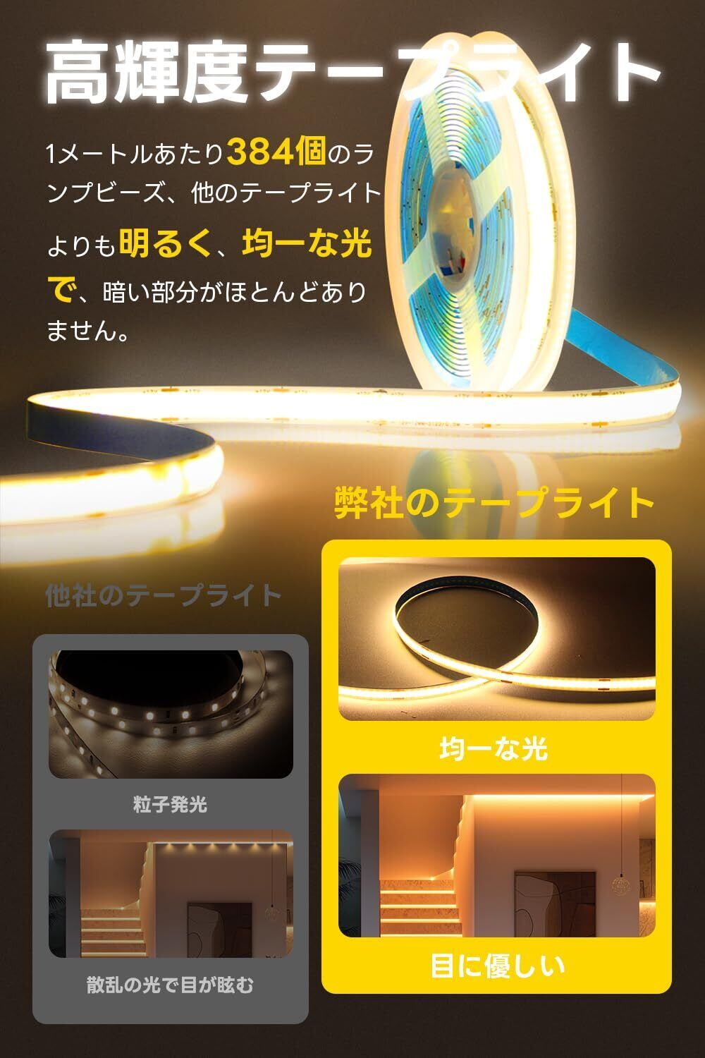 【高輝度】COB テープライトには 1 メートルあたり 384 個の LED があります。従来の SMD テープライトと比較して、ランプビーズの密度が高く、より明るく柔らかい光を生成するため、装飾照明に非常に適しています。ご注意:プラグなし