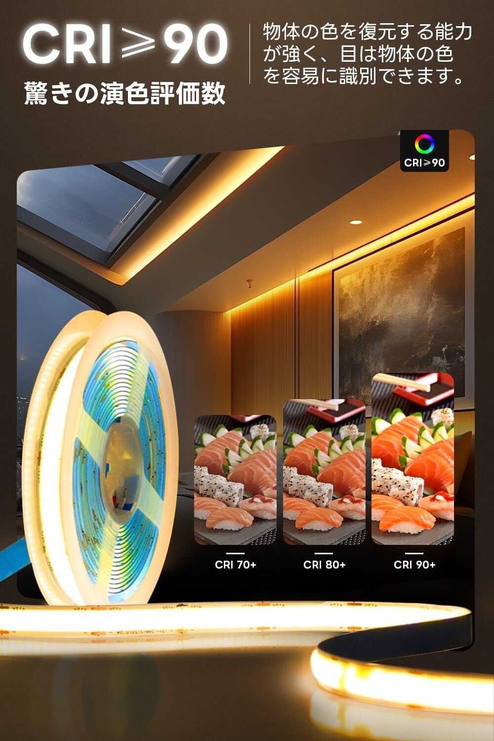 【CRI≥90驚きの演色評価数】物体の色を復元する能力が強く、目は物体の色を容易に識別できます。黒い点もちらつきもありません