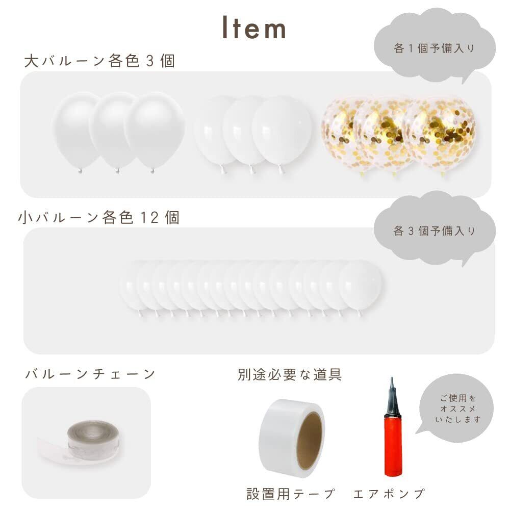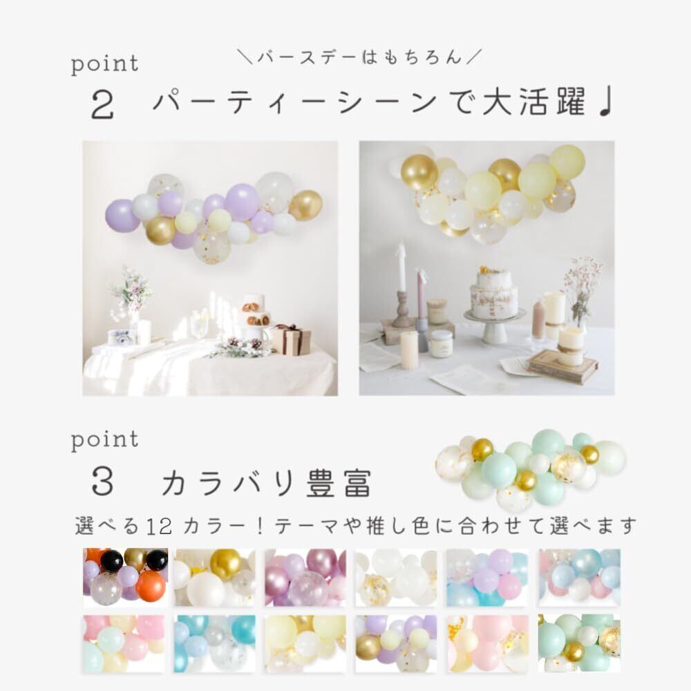【注意事項】・ゴムバルーンは稀に検品では見つけにくい穴があいている場合がございます。予備バルーン各1個をお入れしておりますので、万一の際はご活用下さい。 ・小さなバルーンは口での膨らし難しい場合がございますのでエアポンプのご使用を推奨しております。・バルーンガーランドは約10日間ほどお楽しみいただけますが、空気を入れて作ってから約3-4日でツヤが無くなってきます。個体差、結びの度合いによってしぼみが早い場合があります。