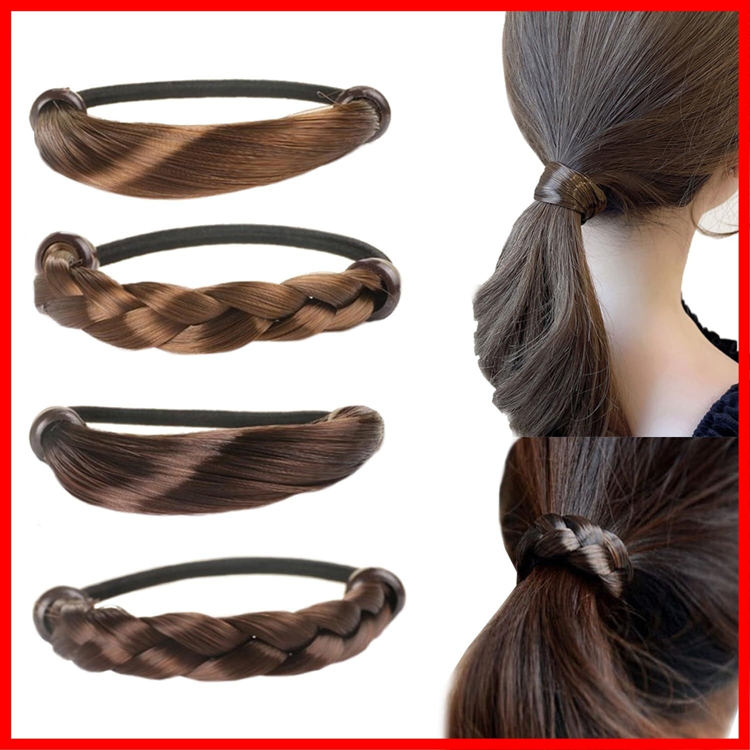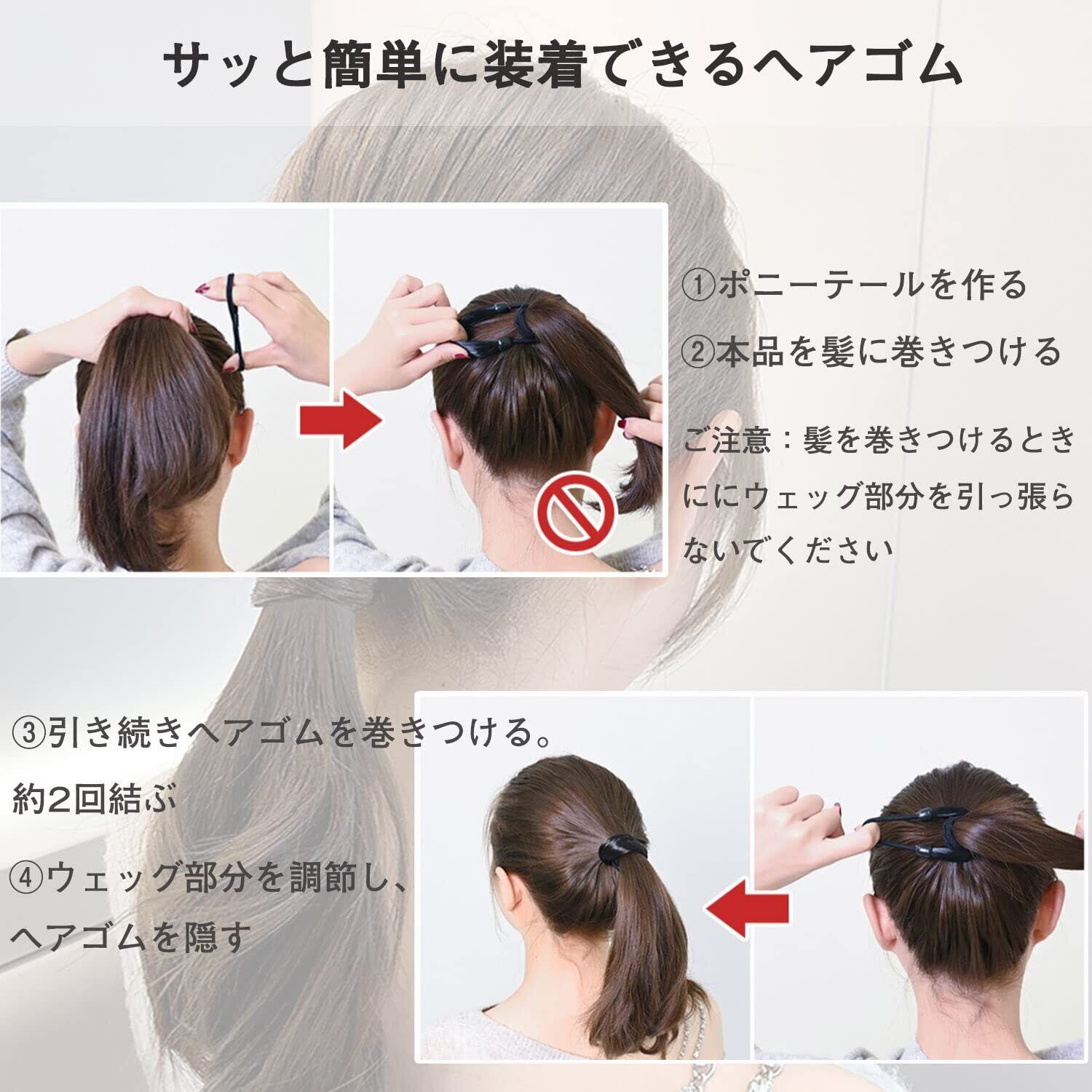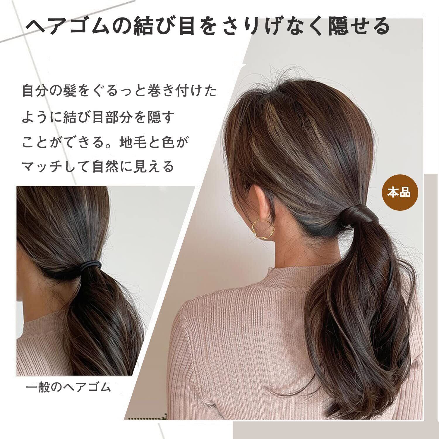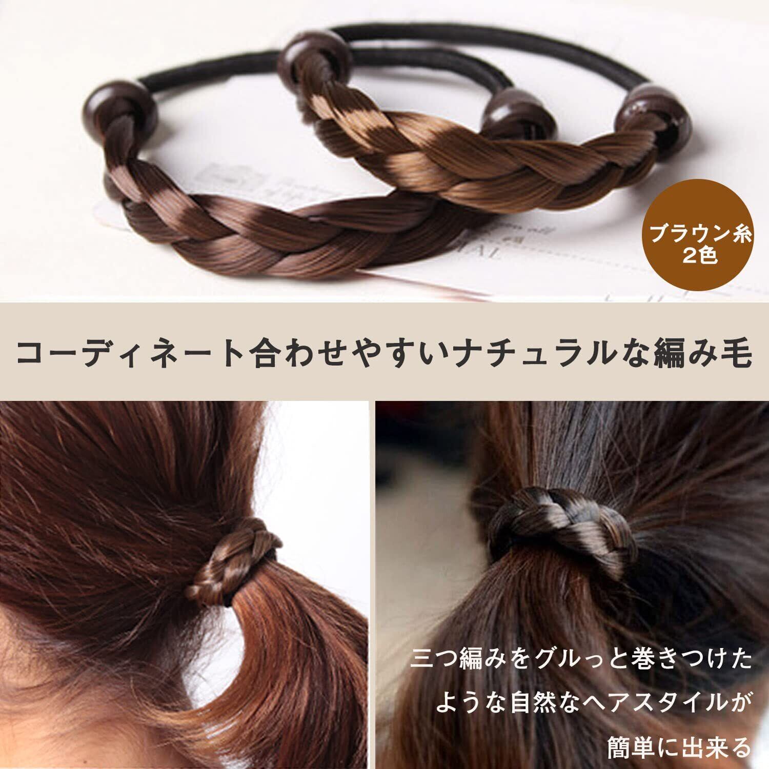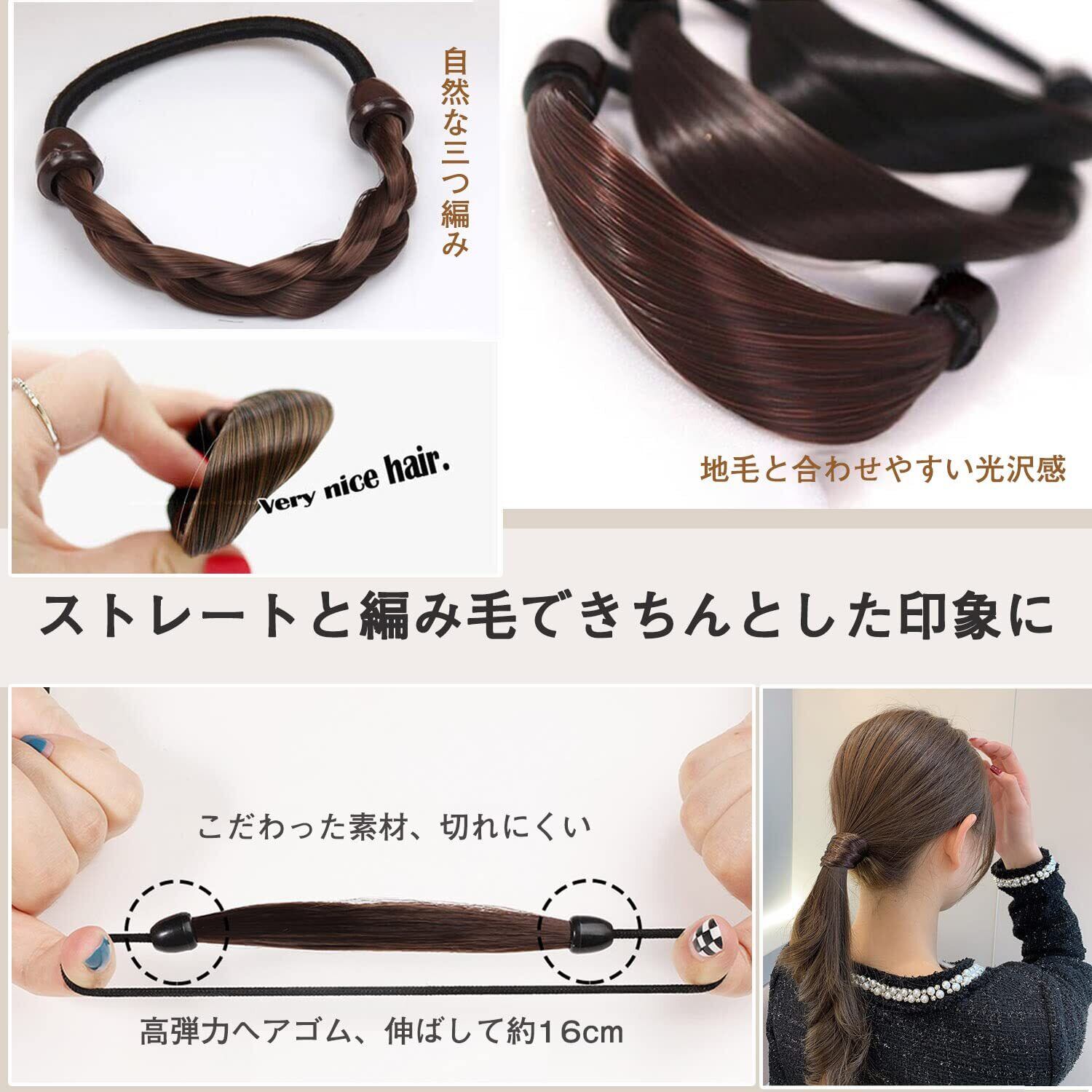 【自然なスタイル髪ゴム】髪の毛をぐるっと巻きつけたようなナチュラルなヘアスタイル。日本人の髪色に合わせたダークブラウンとブラウンの色で、それぞれのストレートと編み毛を採用してきちんとした印象に。また光沢感があり、地毛と色がマッチしていて自然な感じに見える。