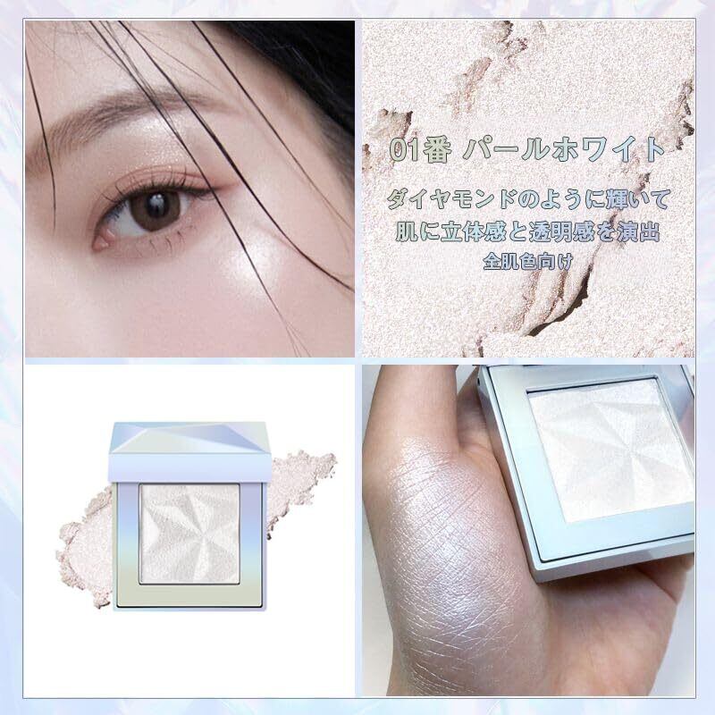 使用方法: 顔、鎖骨、肩など、明るくしたい部分にハイライトパウダーを適量なじみ、たった一塗りで、ダイヤモンドのようにマルチで輝く輪郭を実現。