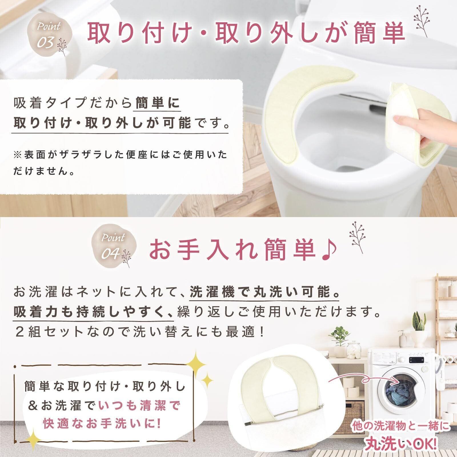 【ご注意ください】️商品はご購入時、2枚1組を抱き合わせておりその中央部に薄い透明フィルムが1枚貼り付けてあります。こちらの透明フィルムは吸着しませんので、剥がしてからご使用ください。️吸着による貼り付けの為、ザラザラした面にはご使用いただけません。(ベタベタする粘着剤による貼り付けではありません。)️便座の座面及び便座シートの吸着面は、しっかりと乾かした状態で貼り付けてご使用ください。️厚みがある為、フタの形状によっては便座を上げた際便座が倒れてくる、フタが完全に閉まらない場合がございます。️お洗濯の際は、記載する取扱い表示記号に従ってください。