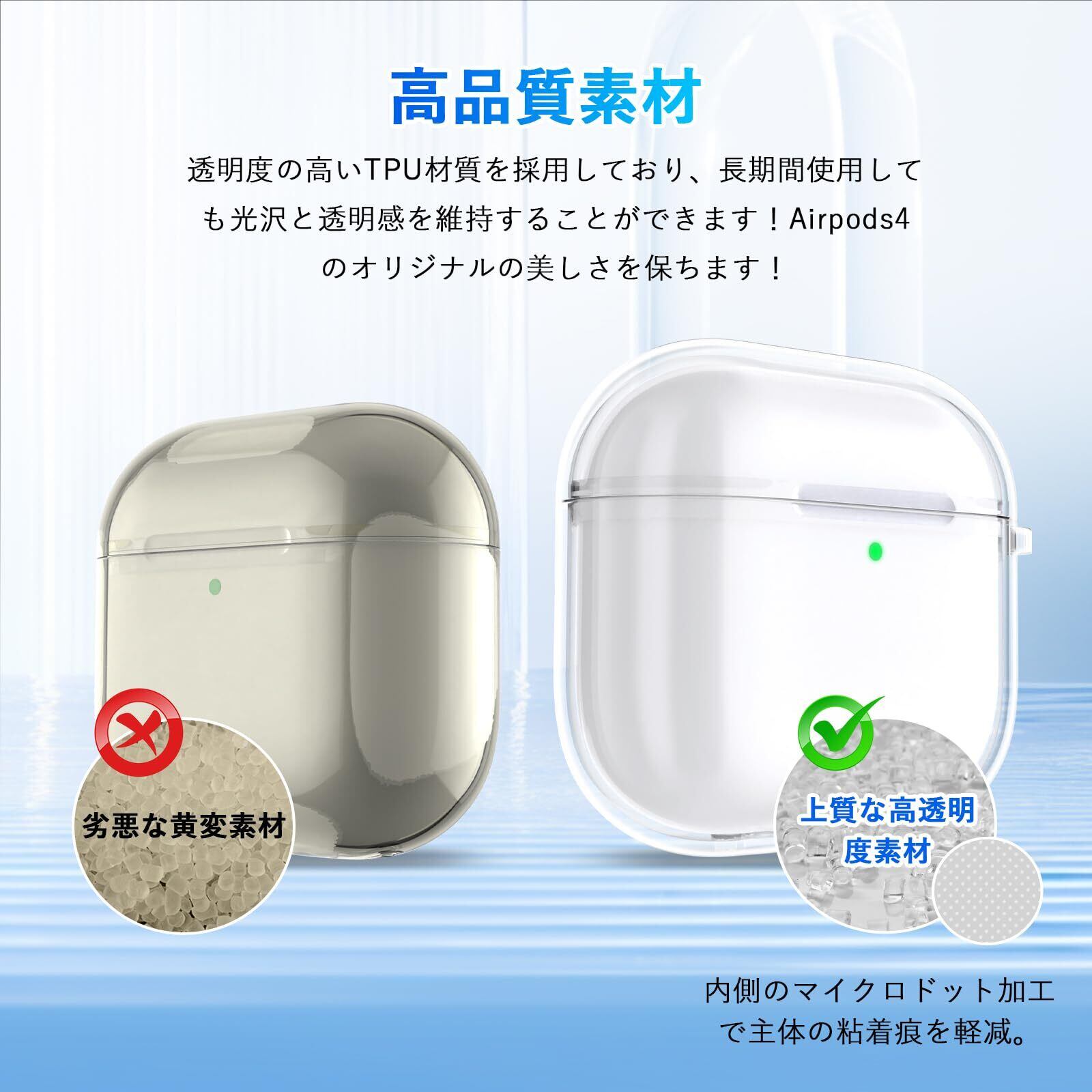 【高品質素材】透明度の高い高品質TPUで製作されるので、手触りが良くて耐久性が抜群です。Airpods4本来のデザインを損なうことのない、シンプルで高級感のある仕上がり。