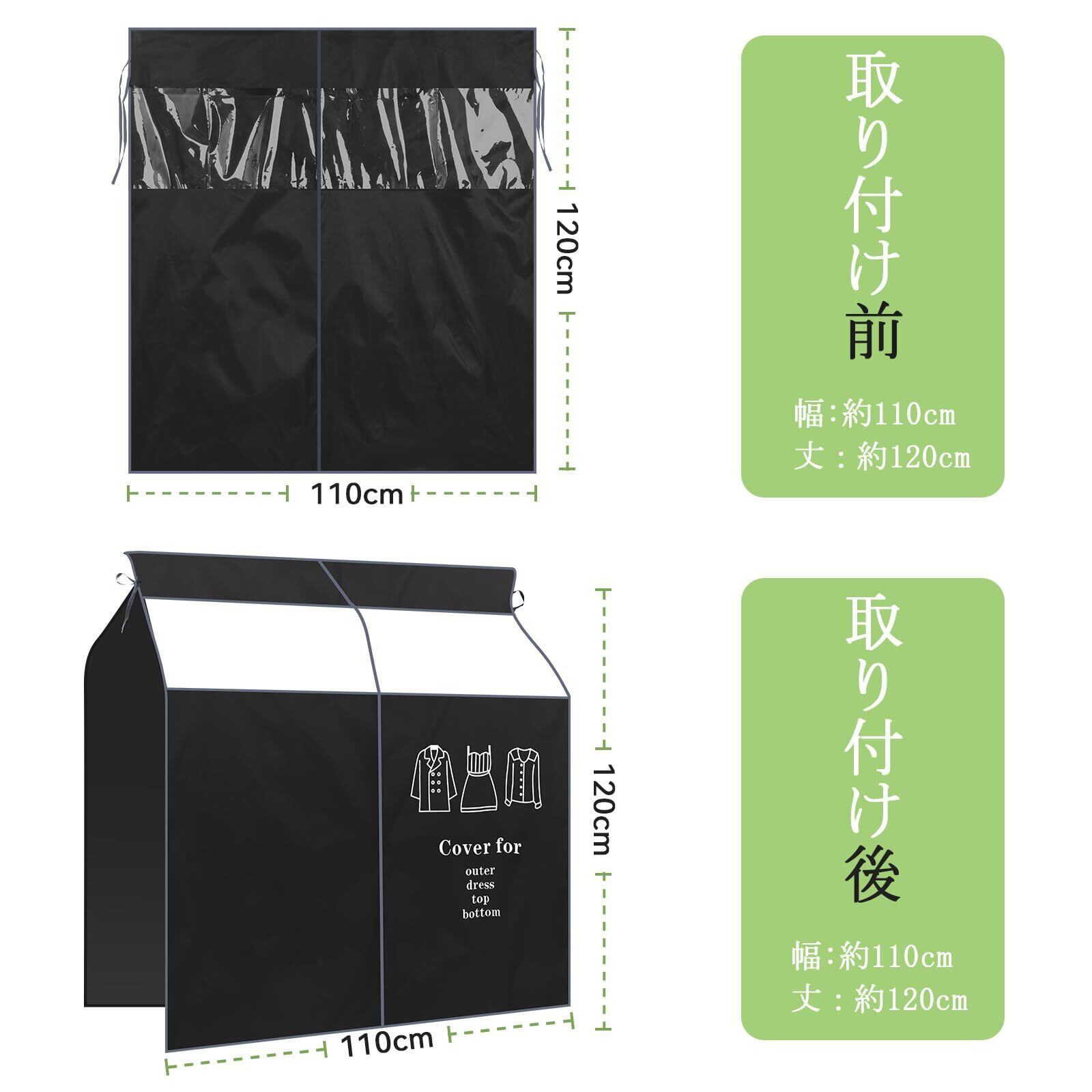 【商品仕様】サイズ:幅110cmx120cm高さ。ハンガーラックをすっかりカバーできるので、ベッドルーム、ベランダ、洋服ラックなど場所には使用できます。