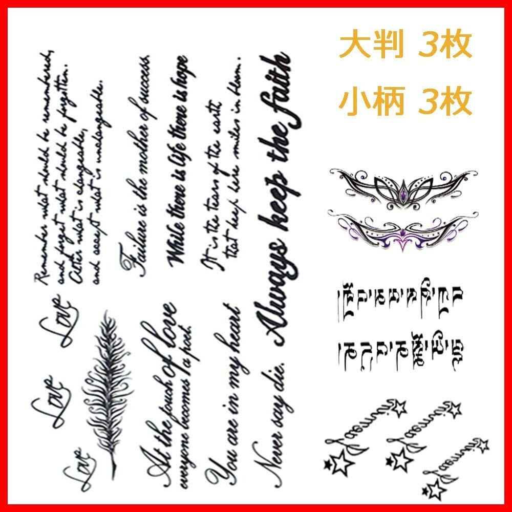 Yesallwas タトゥーシール 英文字 6枚セット(大判3枚 +小柄 3枚) タトゥーステッカー ボディーシール メンズ 刺青シール 防水 腕、足、体、胸、肩、背中に簡単貼る tattoo