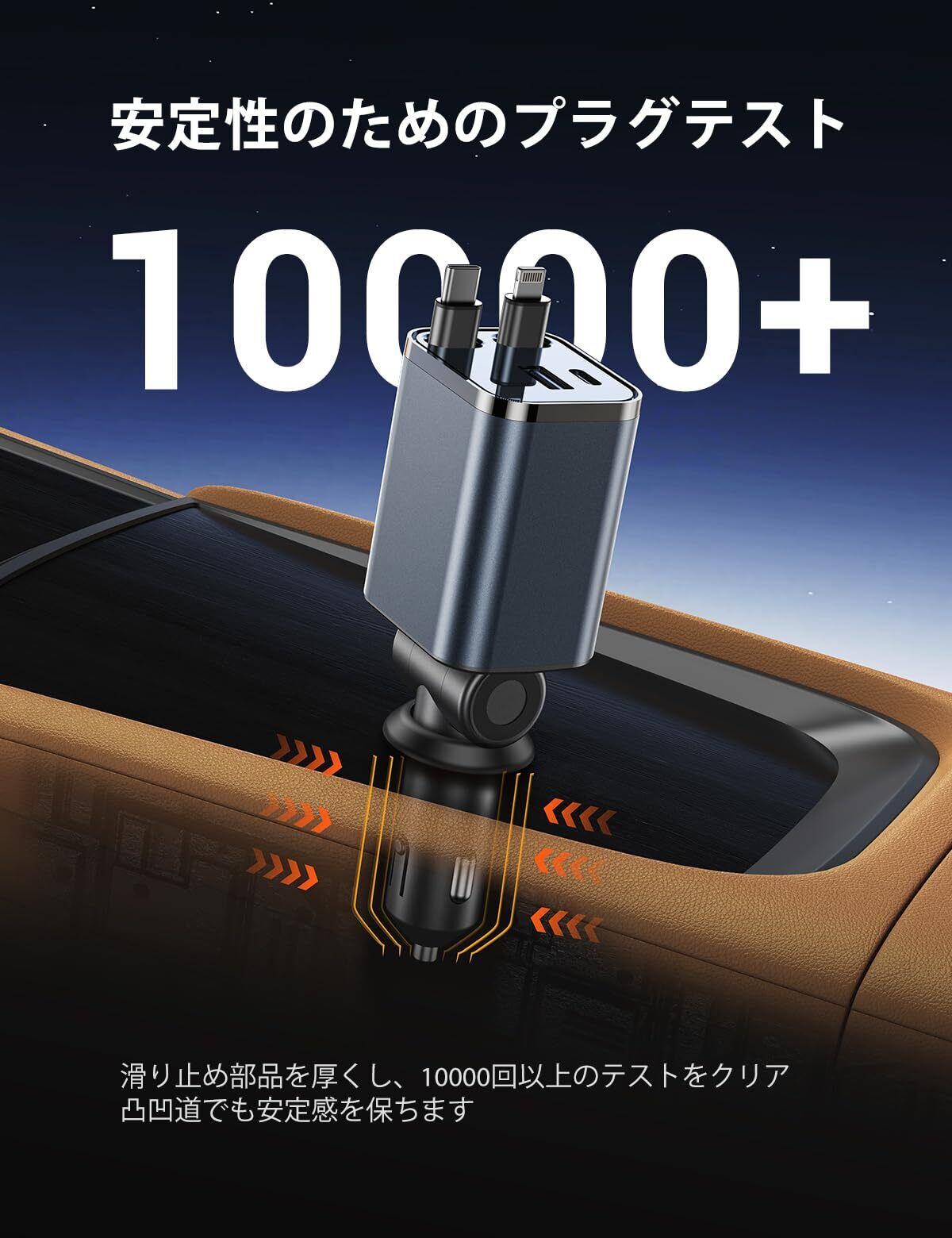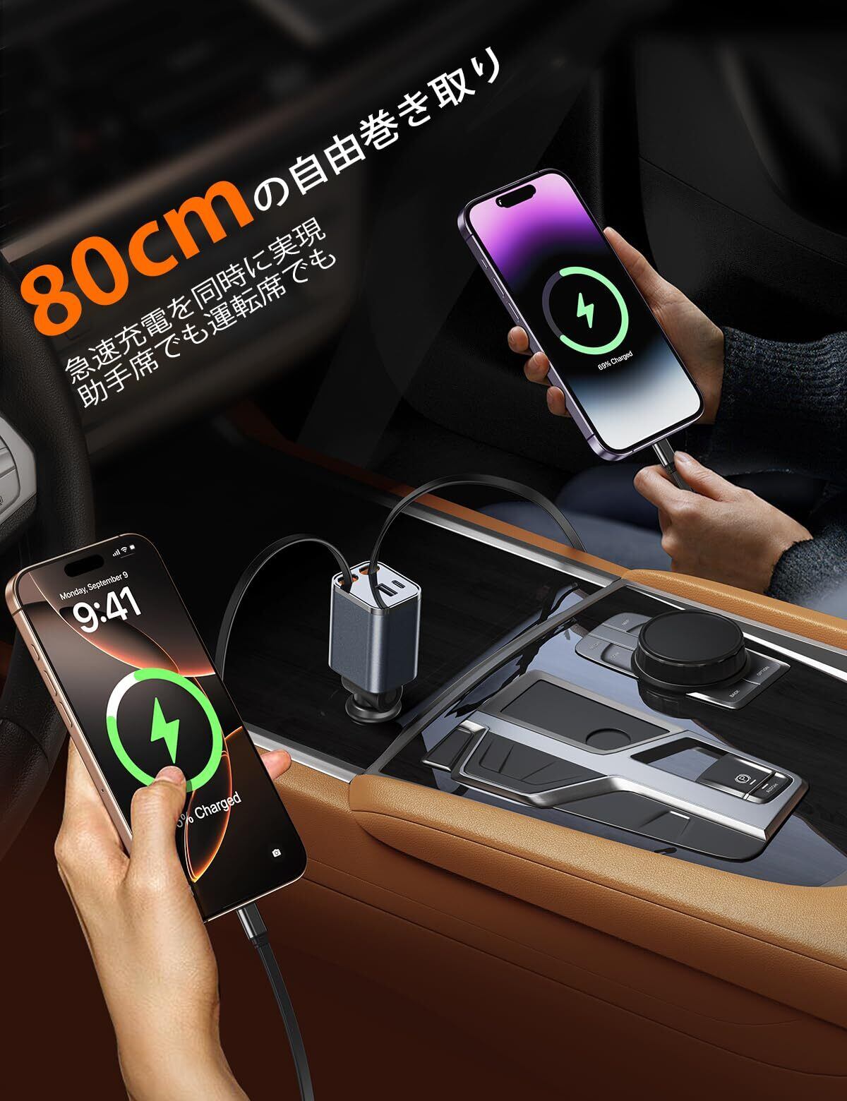 4台同時高速充電器 車:巻き取り式充電ケーブル 2本付き(Type-C 30W/Lightning 27W)、2つのUSBポート(USB 15W/Type-C 15W)、4台のデバイスを同時に充電できます