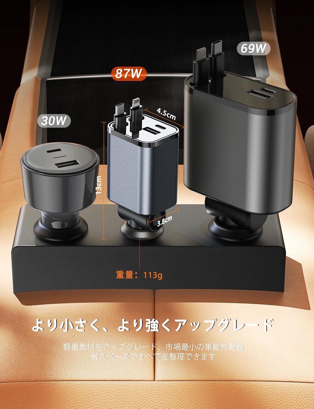車 充電器 巻き取り・小型軽量化:130x45x38mm、重さ113g、アップグレード後はより小さくより強く、市場最小の巻き取り式車載充電器