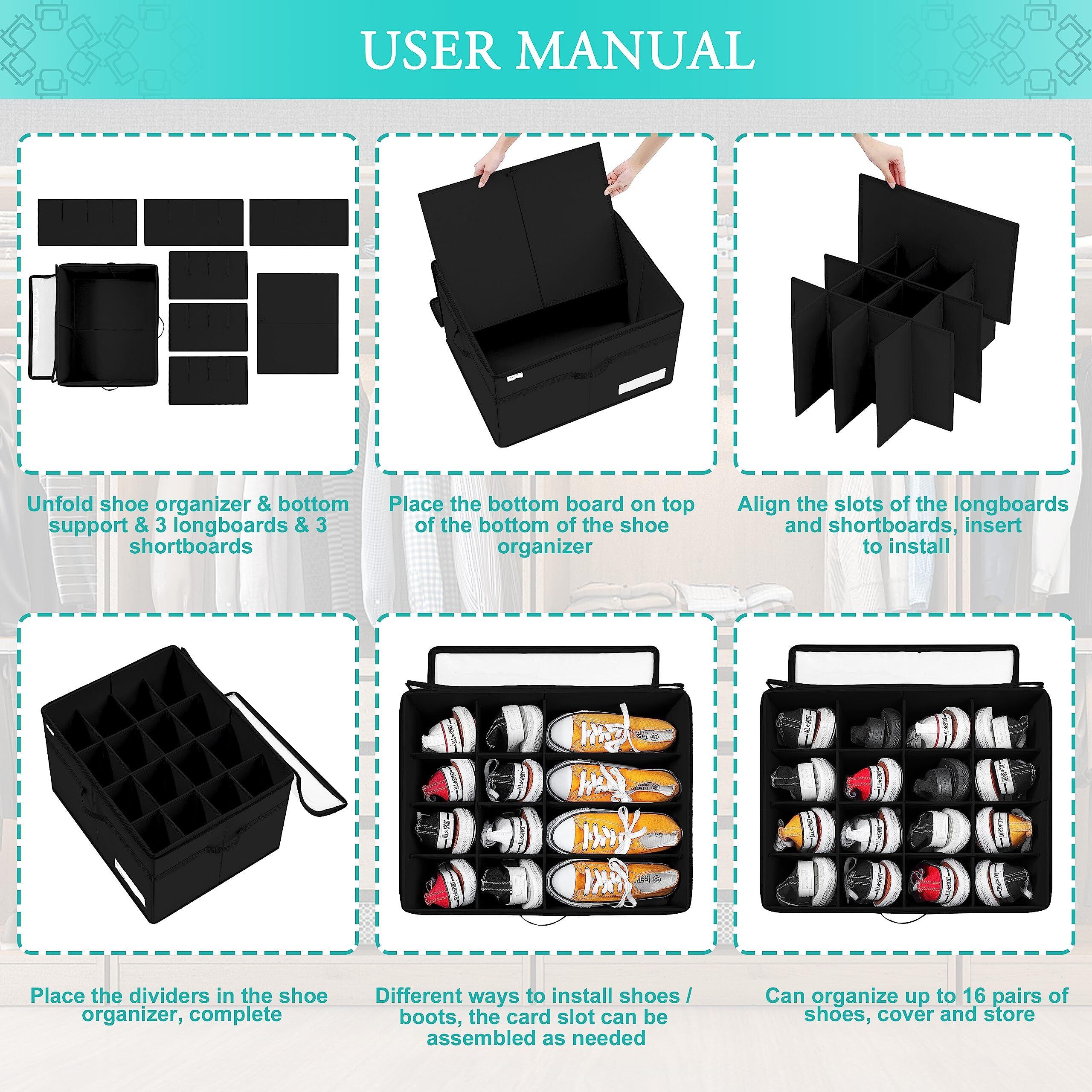 靴収納オーガナイザー - この仕切り付き靴箱オーガナイザーは、クローゼットにある靴を最大16足まで収納できます。寸法は53x42x33cmで、それぞれ13x10.5cmの16のコンパートメントがあります。靴の収納バッグは、使わないときは平らに折りたたんでスペースを節約することができます。あらゆるサイズのご家庭に対応する省スペースソリューションです。これは特許取得済みのデザインです。