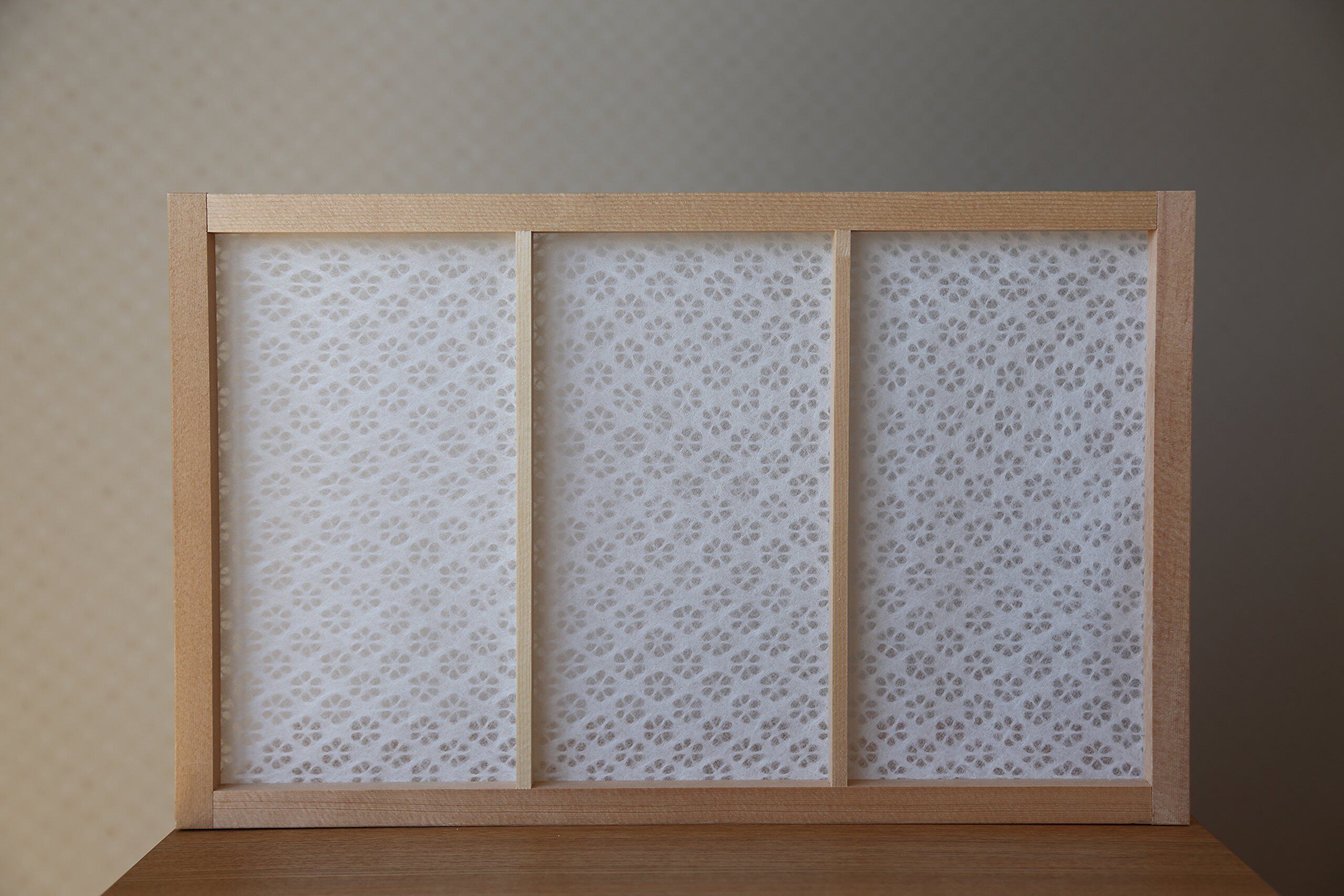 ●日本の伝統柄である麻の葉紋様を前面に付けた障子紙。障子紙工房は小梅柄もあり、部分的に張り替える事で、破れ補修にも使用できる