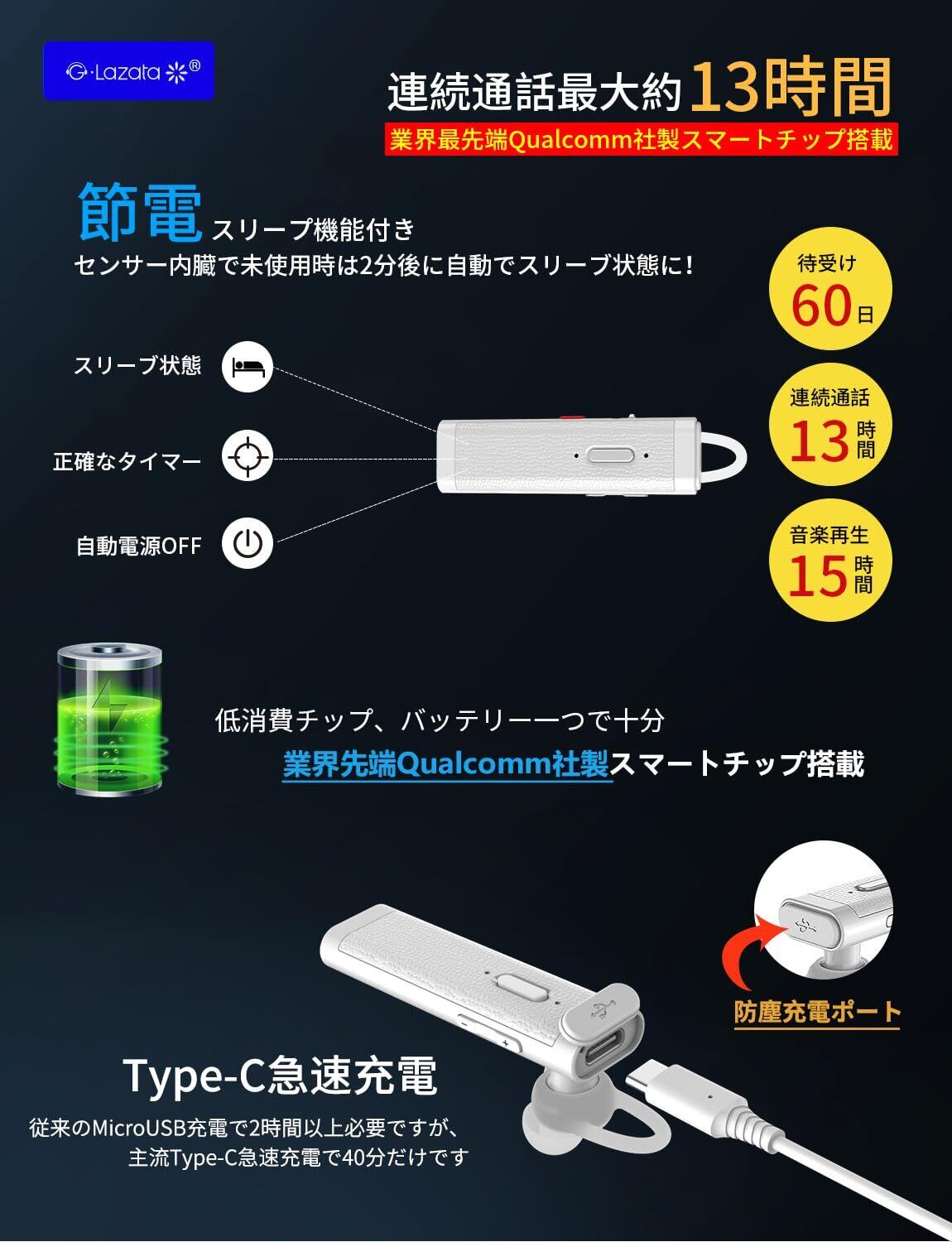 【急速充電スマートチップ搭載】業界最先端Qualcomm社製スマートチップ搭載により、低消費電力を実現、外出or旅行の時、長時間通話実現。「再生時間は楽曲、音量、使用環境により、変動するかもしれませんので予めご了承ください。」