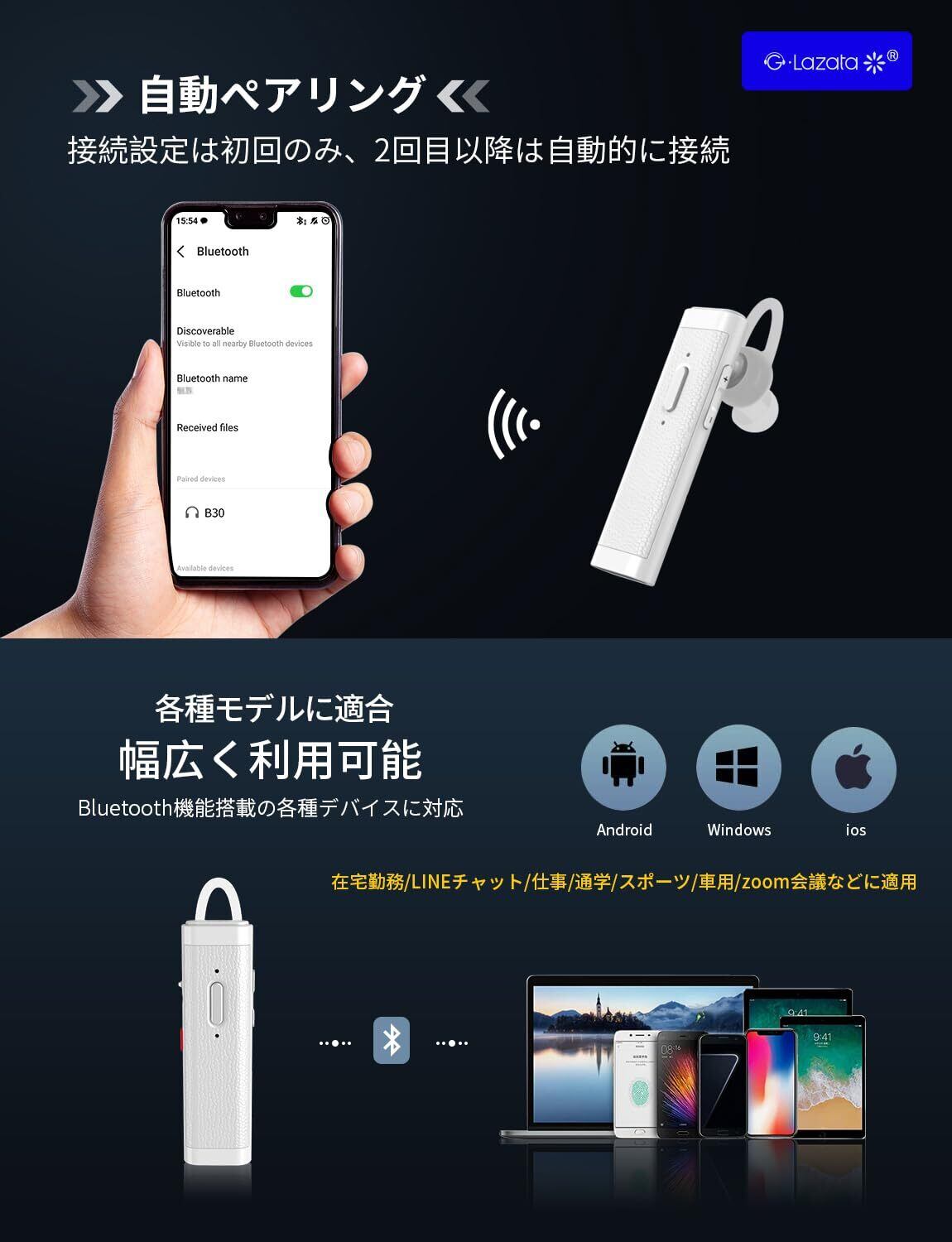 【軽薄型】Lazata 日本語音声 片耳イヤホン Bluetooth Qualcomm社製スマートチップ搭載【aptX & aptX HD、SBC・AAC対応 デュアルマイク通話設計 ENCノイズ低減技術 ミュート/SIRI搭載 】急速充電スマートチップ搭載 MEMS高感度マイク内蔵,Scms-t,ガラケー、iOS, android, Windows対応「1個入り」 「白」 | hananoki