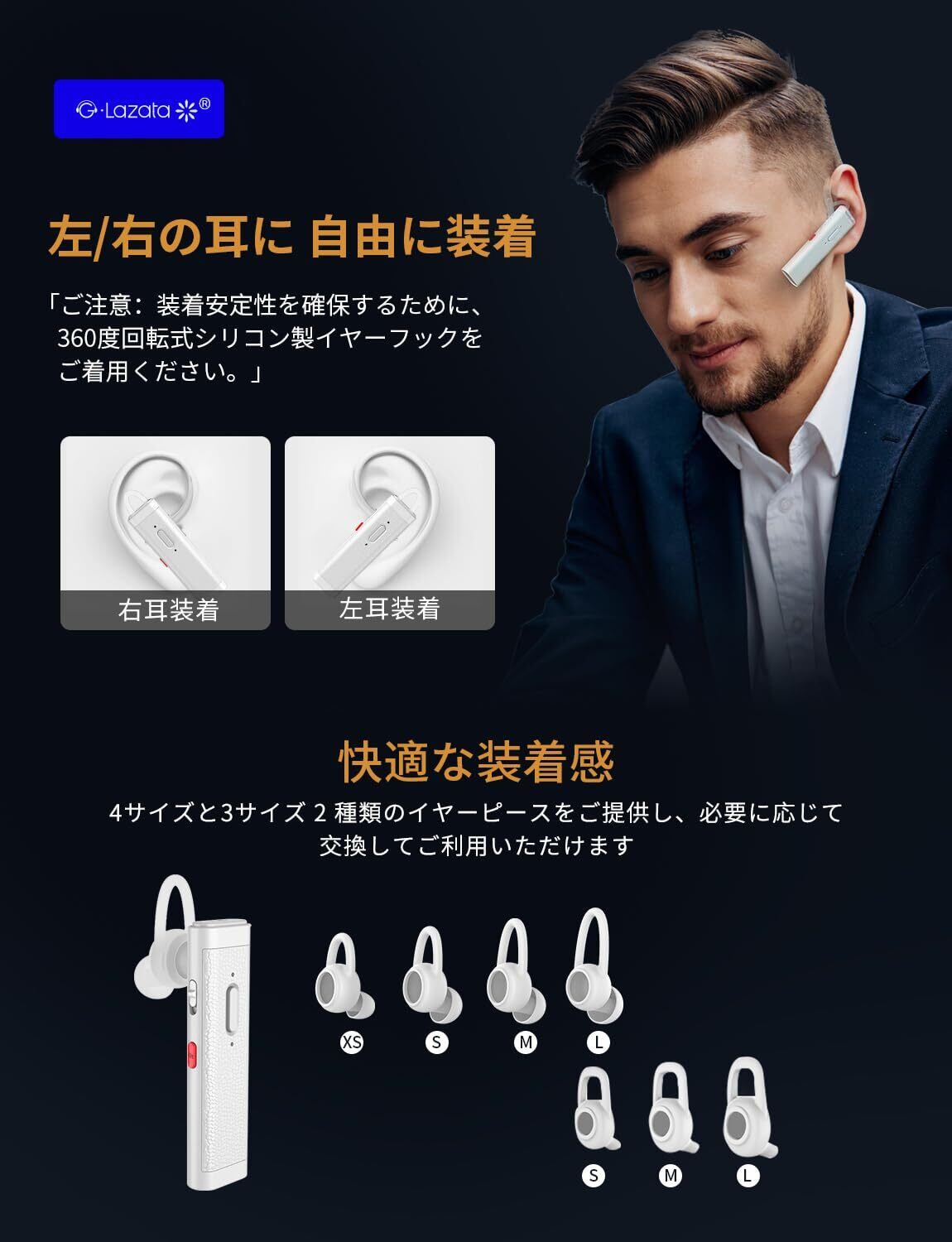 【軽薄型】Lazata 日本語音声 片耳イヤホン Bluetooth Qualcomm社製スマートチップ搭載【aptX & aptX HD、SBC・AAC対応 デュアルマイク通話設計 ENCノイズ低減技術 ミュート/SIRI搭載 】急速充電スマートチップ搭載 MEMS高感度マイク内蔵,Scms-t,ガラケー、iOS, android, Windows対応「1個入り」 「白」
