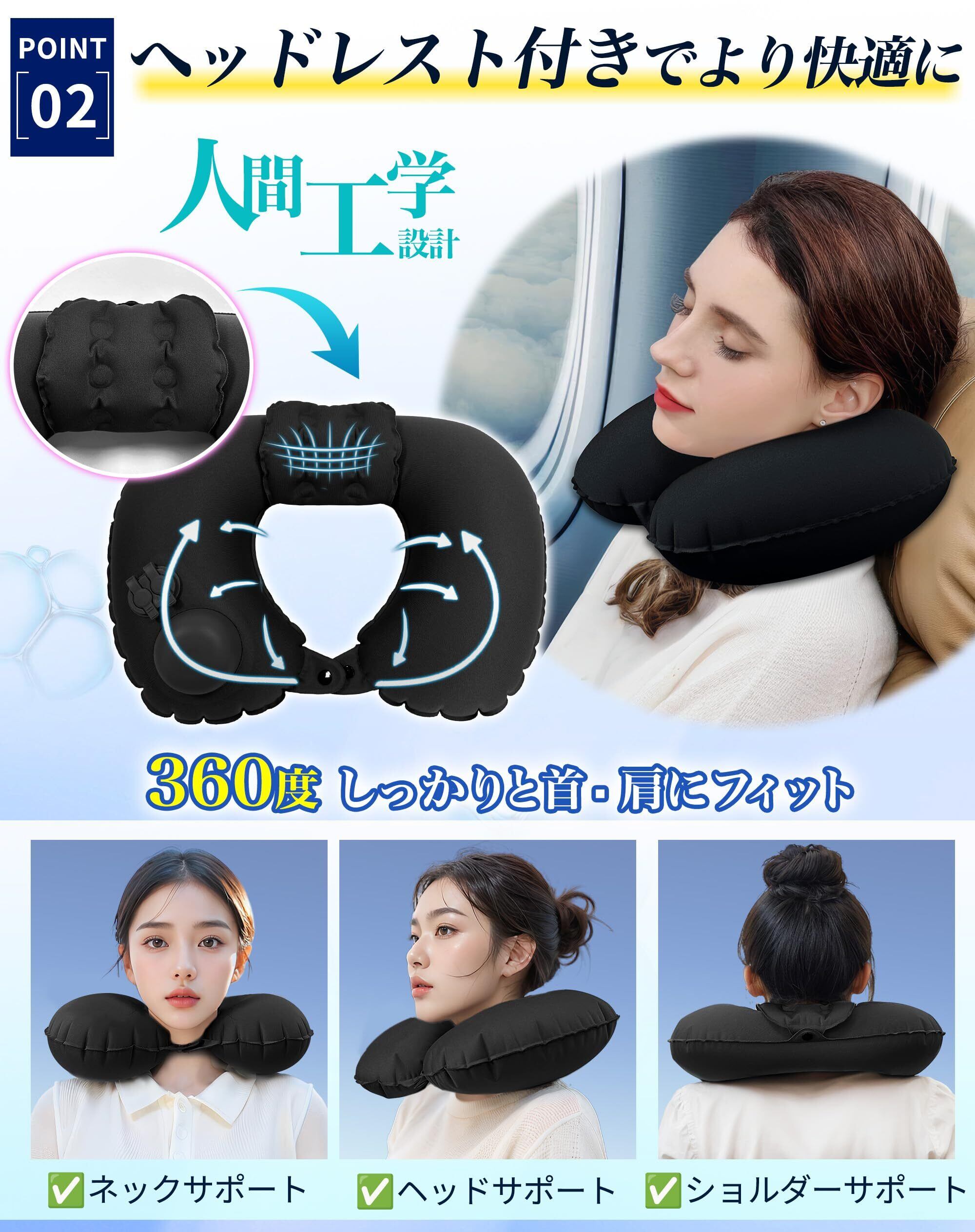 【ヘッドレスト付きでより快適に】人間工学に基づいた3D設計により、よりフィット感がUP、首の位置が合わない時は空気量や枕の向きを変えてあなた好みに微調整可能。他のエアーネックピローよりも空気量が多くしっかりと首をサポートする形状に仕上がっています。空気の量をMAXにしてしっかり首元を包み込んでいます。