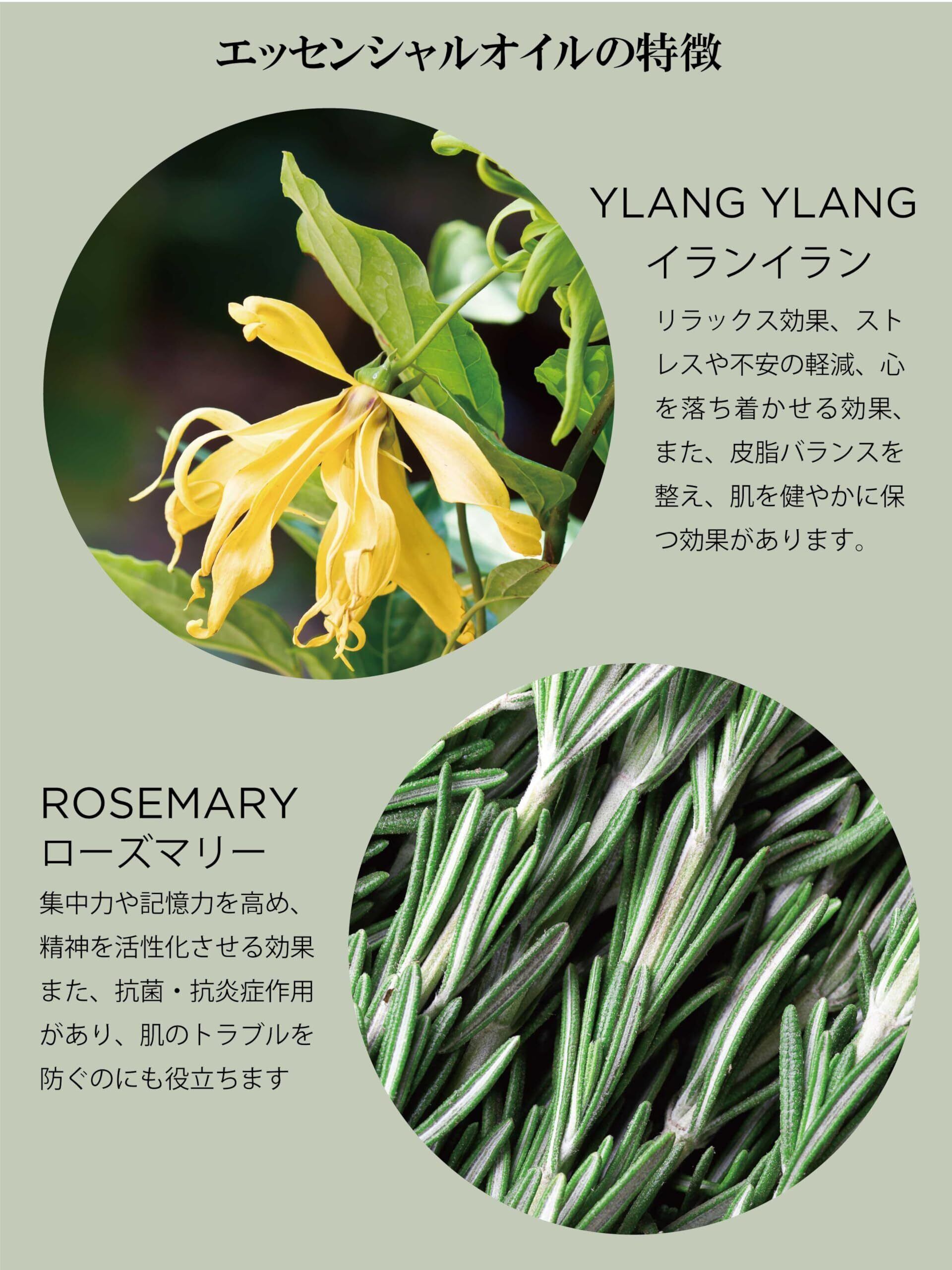 香り:イランイラン・ローズマリー・ゼラニウム(天然精油)