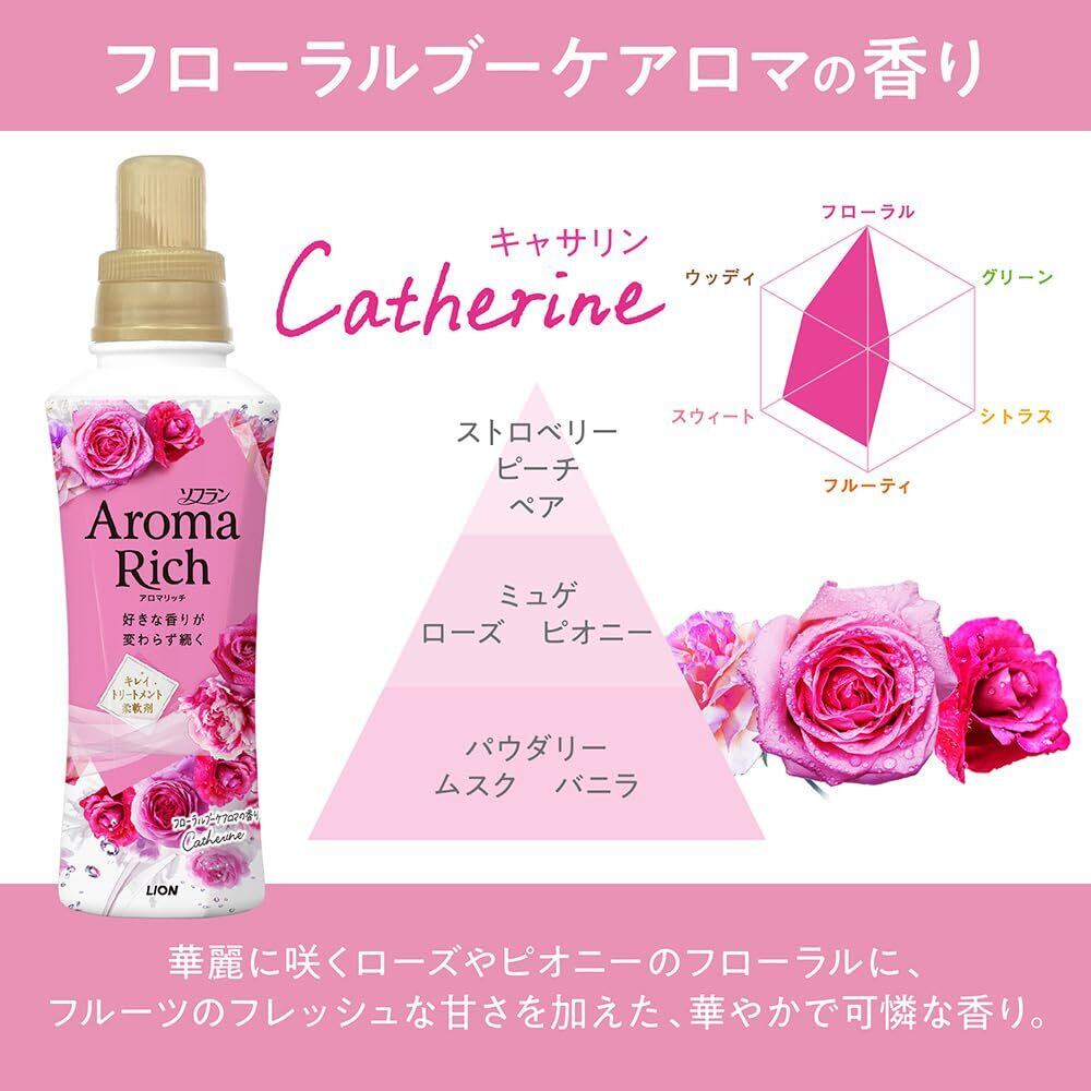 ●華やかさがありながら、清潔感のある女性をイメージしたフローラルブーケアロマの香り Catherine(キャサリン)華麗に咲くローズやピオニーのフローラルに、フルーツのフレッシュさを加えた、華やかで可憐な奥深い香り(※1)ソフランアロマリッチ内(従来品含む)・選んだときの香りの特徴が、注ぐときから脱ぐときまで、ずっと変わらずに続く“咲きたてアロマ製法"。