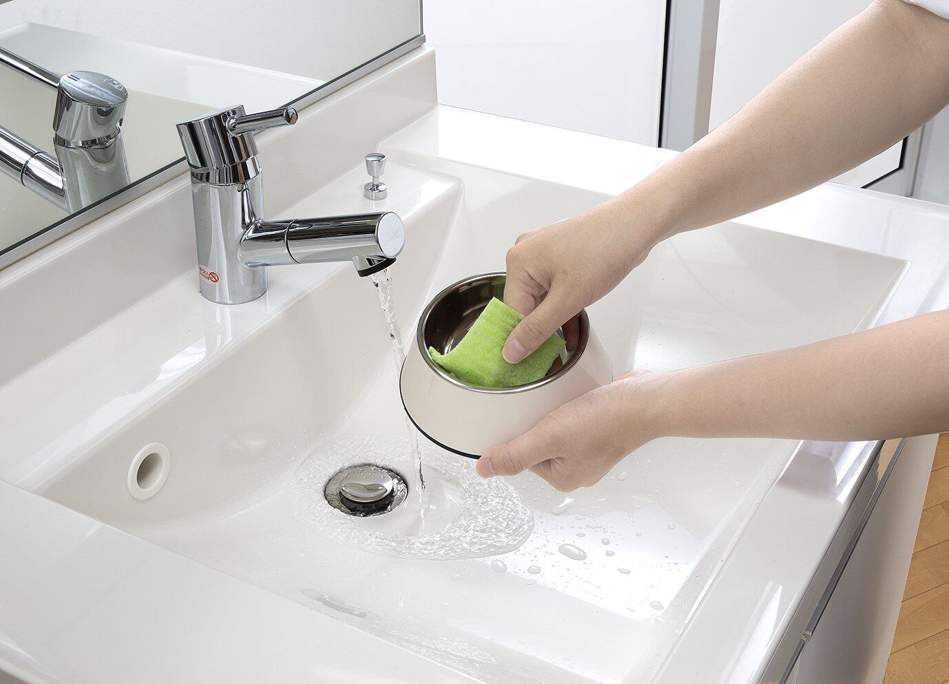 ペットの食器特有のヌメリが綺麗に落とせます。 水だけで汚れを落とす特殊繊維を使用しています。 洗剤を使わなくても、汚れが落とせるのでペットにも安心です。 柔らかい繊維で洗うので、ステンレスやプラスチックを傷つけません。 挟み洗いや曲面も洗いやすい厚みにしています。 表の凹凸面を水で濡らして汚れを落としてください。 たっぷり使える20枚入、保管や取り出しに便利な箱入りです。 1枚が6×8cmですので、使用後は場所をとらず置いておけます。