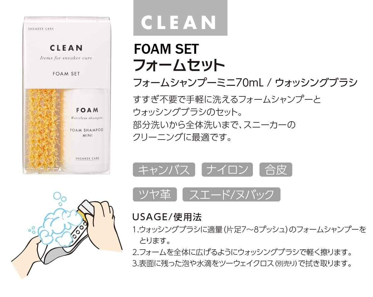 フォームシャンプー&ウォッシングブラシが付いた、スニーカークリーニングに最適なセットです。