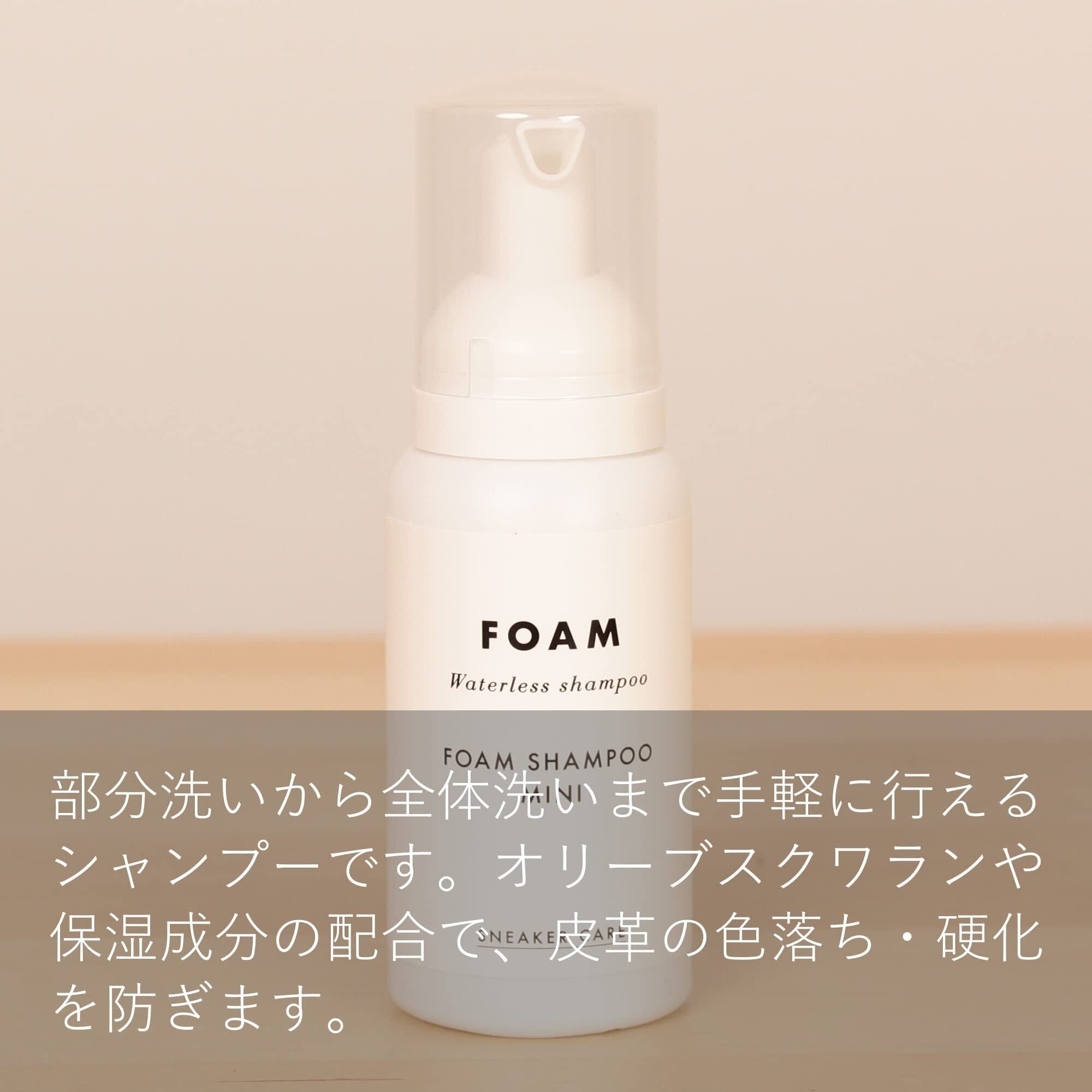 フォームシャンプーはオリーブスクワラン、保湿成分配合で皮革の色落ち、硬化を防ぐことができ、部分洗いから全体洗いまですすぎ不要で使えます。