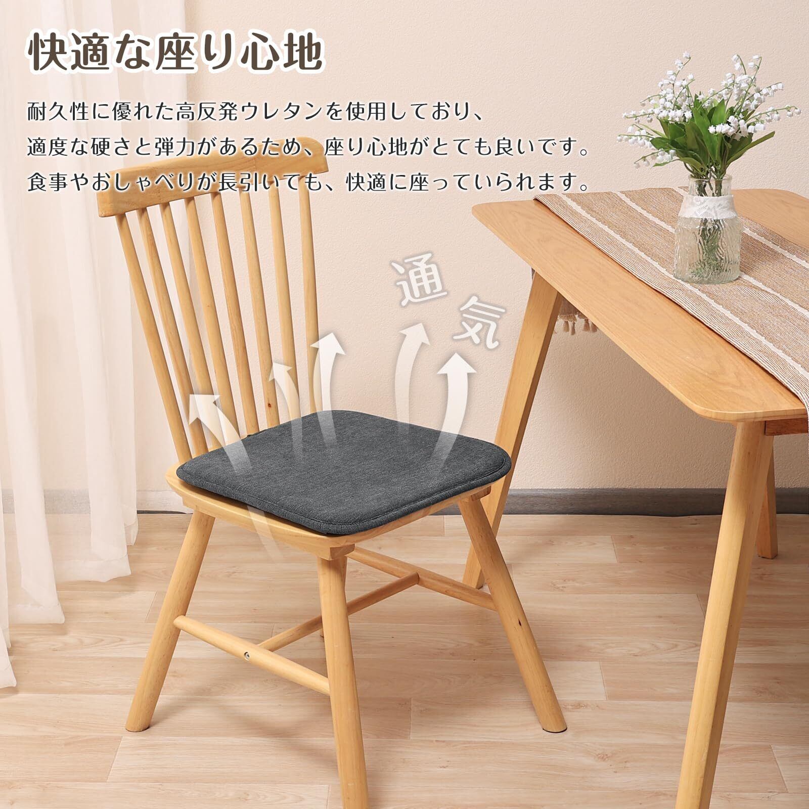 【滑り止めズレない】ダイニングチェアクッションの裏面には環境に優しい滑り止め素材を使用しており、しっかりと固定されるためズレる心配がありません。お子様やお年寄りにも安心してご使用いただけます。