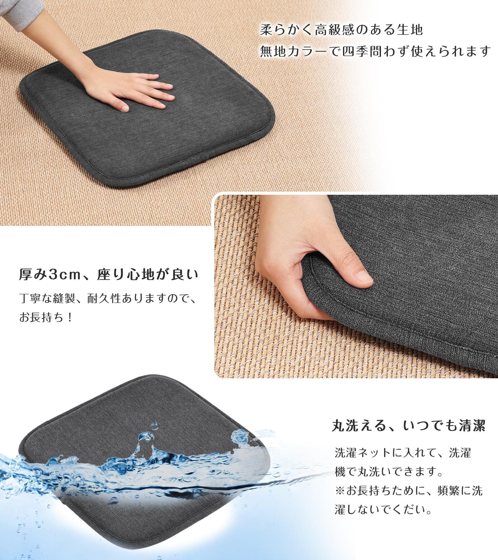 【スクエア座布団のサイズ】幅40×奥行40cm×厚み3cm、ダイニングチェアだけでなくオフィスチェアにピッタリサイズ。 重さ:約230g/枚。材質: 表地は100% ポリエステル生地、中身は3CMの高反発ウレタン、裏面に滑り止め加工。
