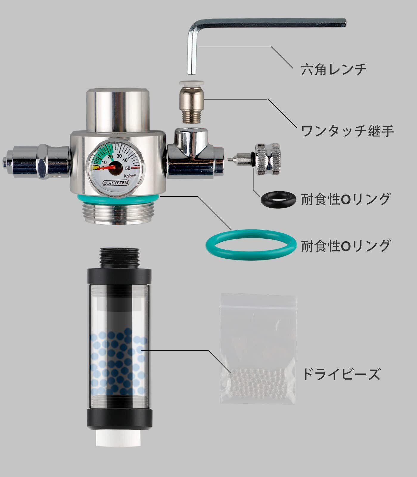 耐食性Oリング(レキュレーターパッキン)×1、 耐食性Oリング(スピードコントローラーOリング)×2、 ワンタッチ継手×1 六角レンチ ×1 フィルタードライビーズ×6