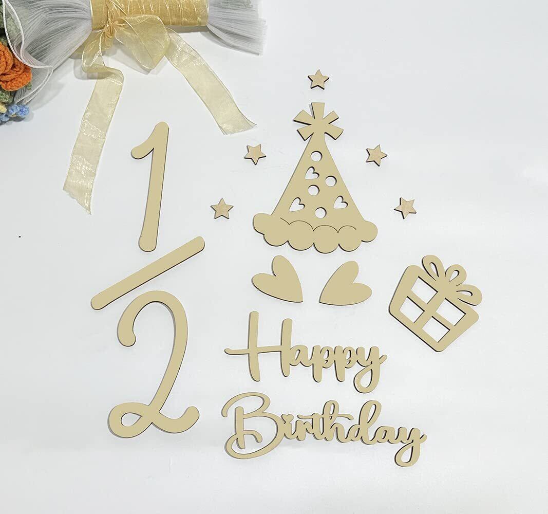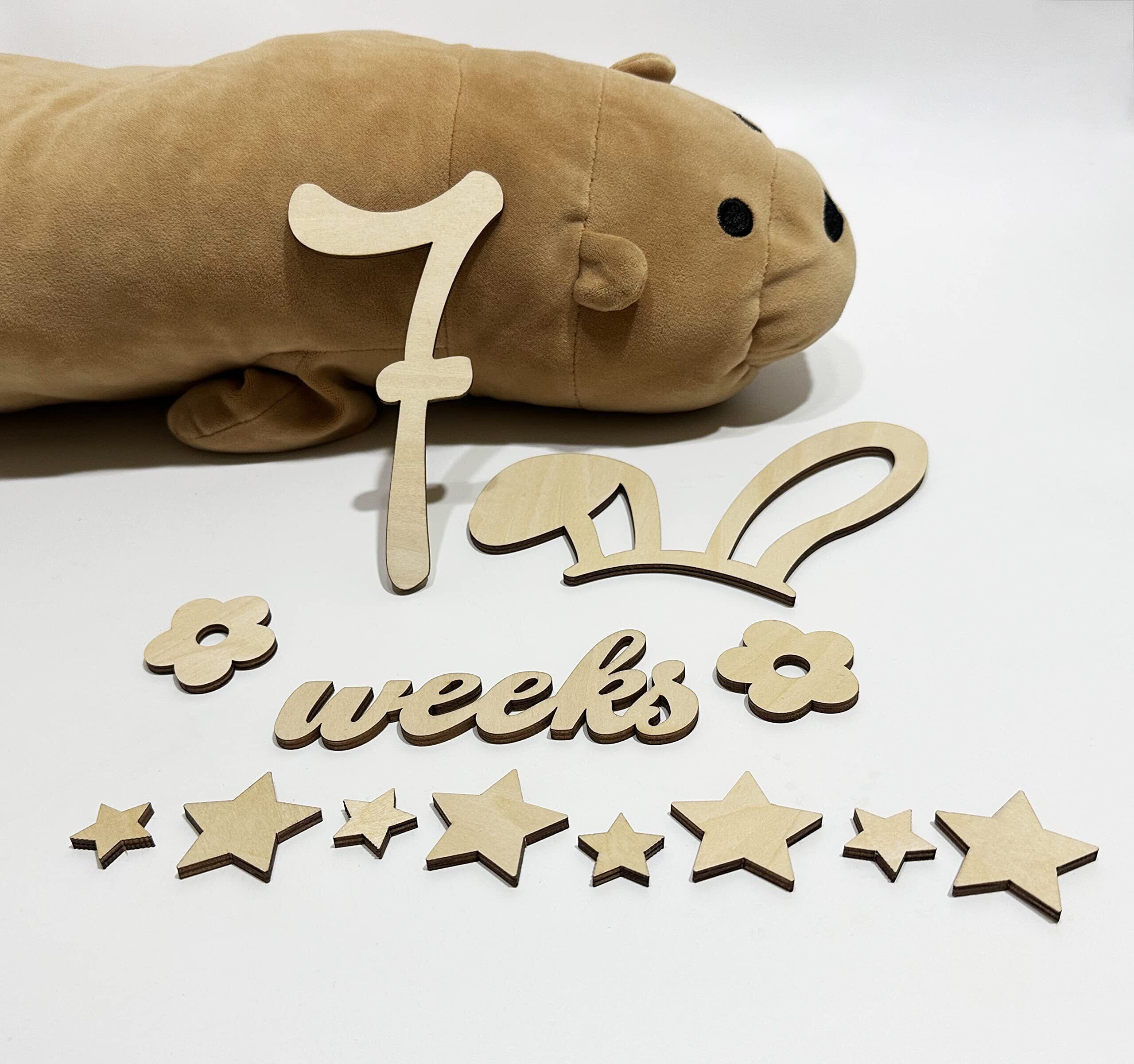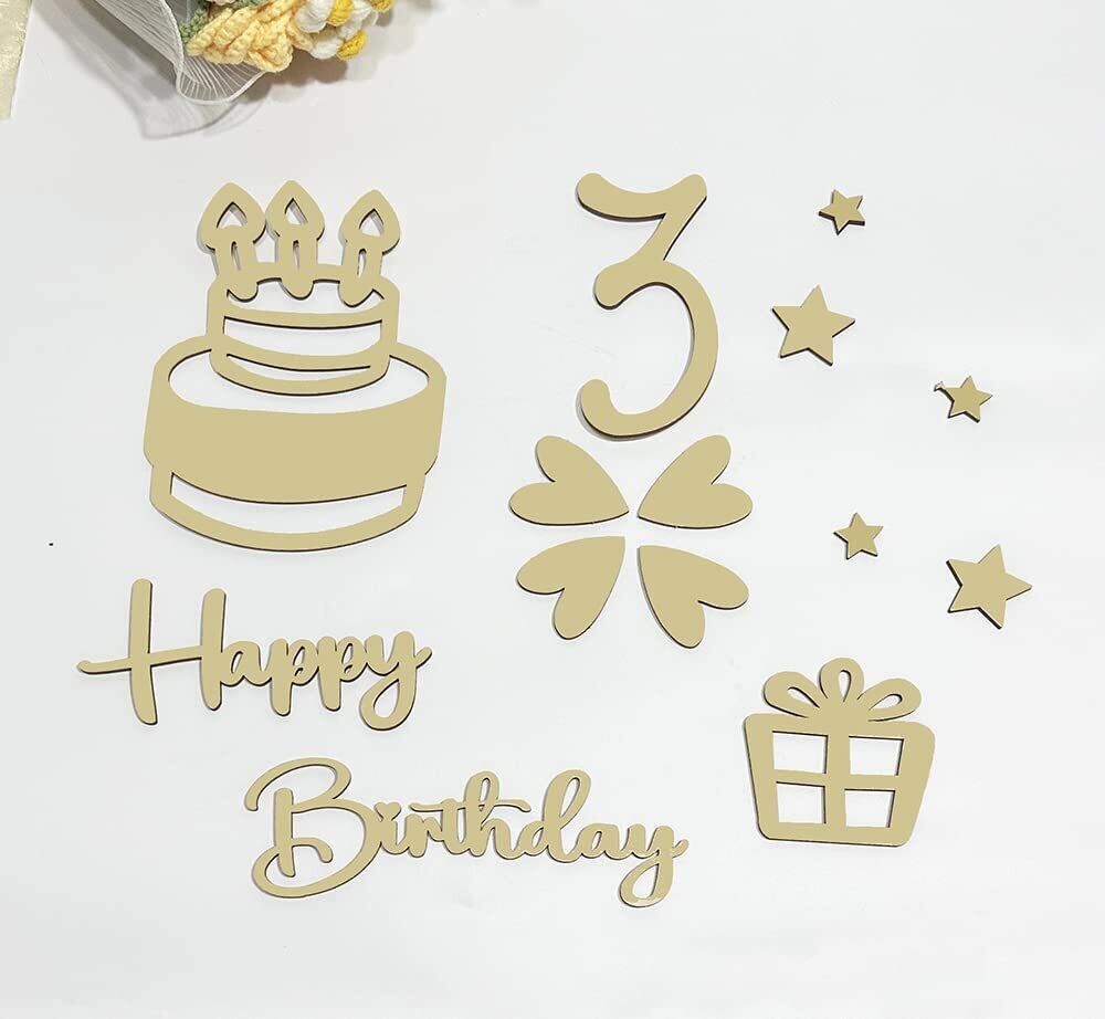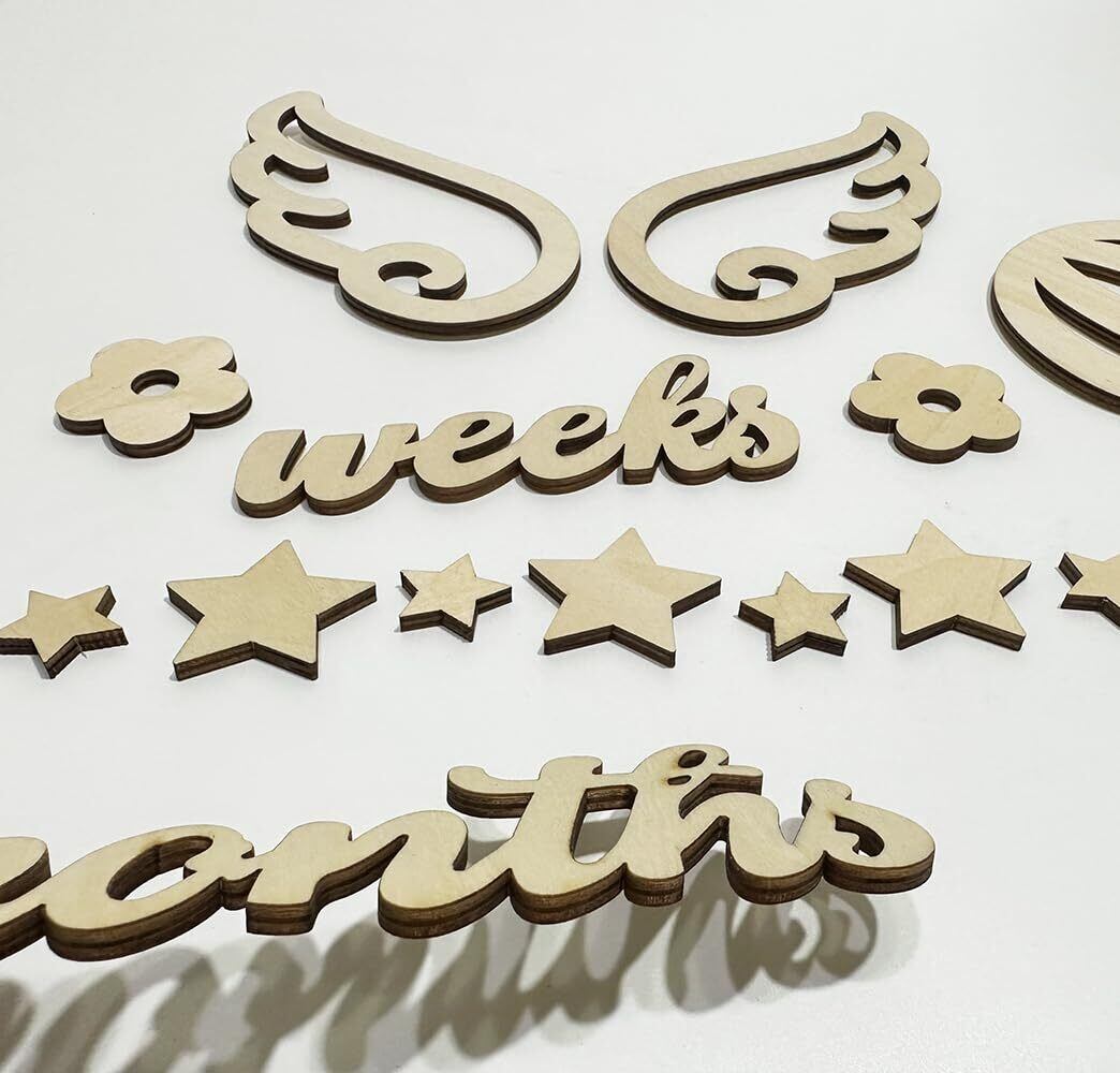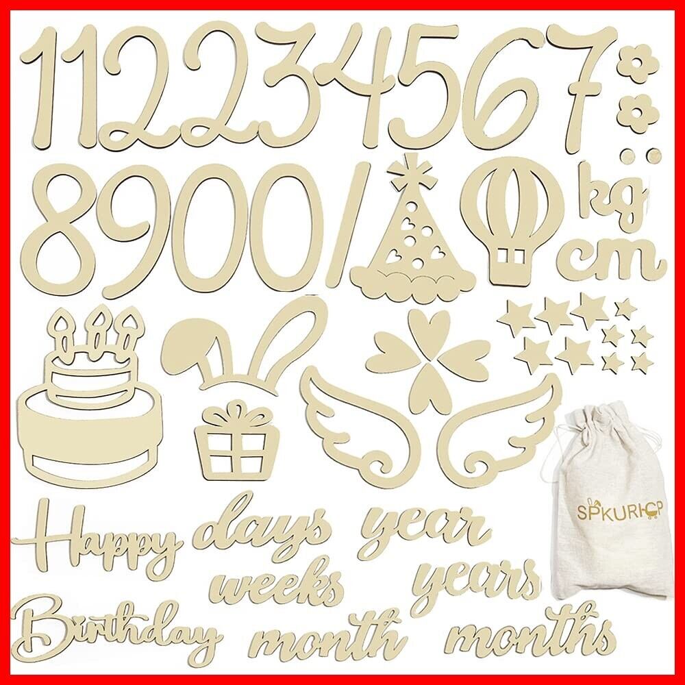 【セット内容】合計49枚セット、0*2枚、1*2枚、2*2枚、3~9各1枚、王冠*1枚、花*2枚、羽*2枚、ハート*4枚、ケーキ*1枚、ギフト*1枚、ウサギ耳*1枚、点*2枚、斜線*1枚、星*10(2サイズ)、kg、cm、happy、birthday、days、weeks、month、months、year、years各一枚、合計49枚、サイズ:写真欄にご参照ください。素材:ウッド、厚さ:約4mm