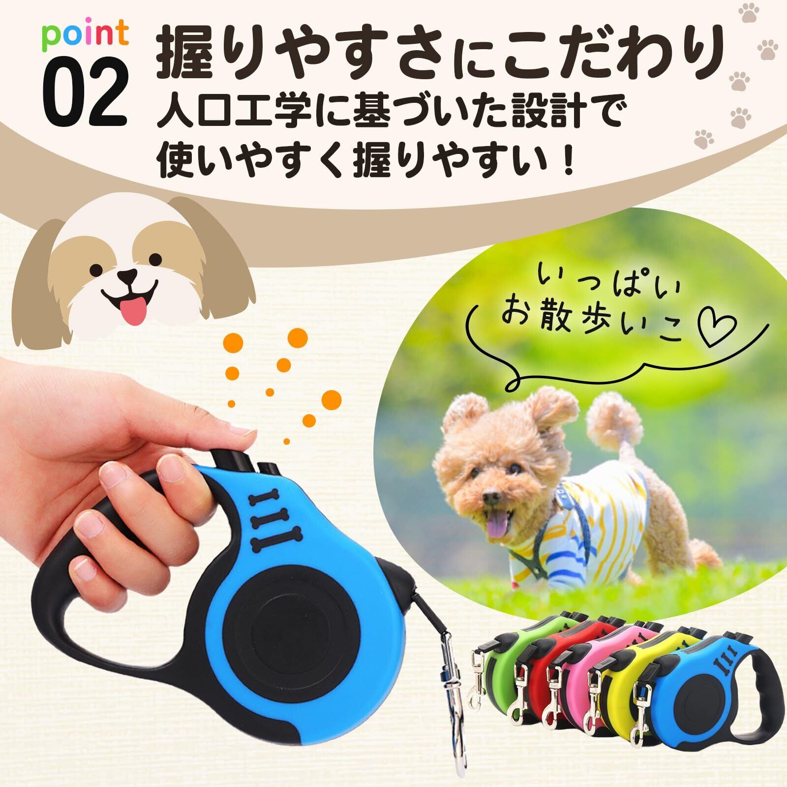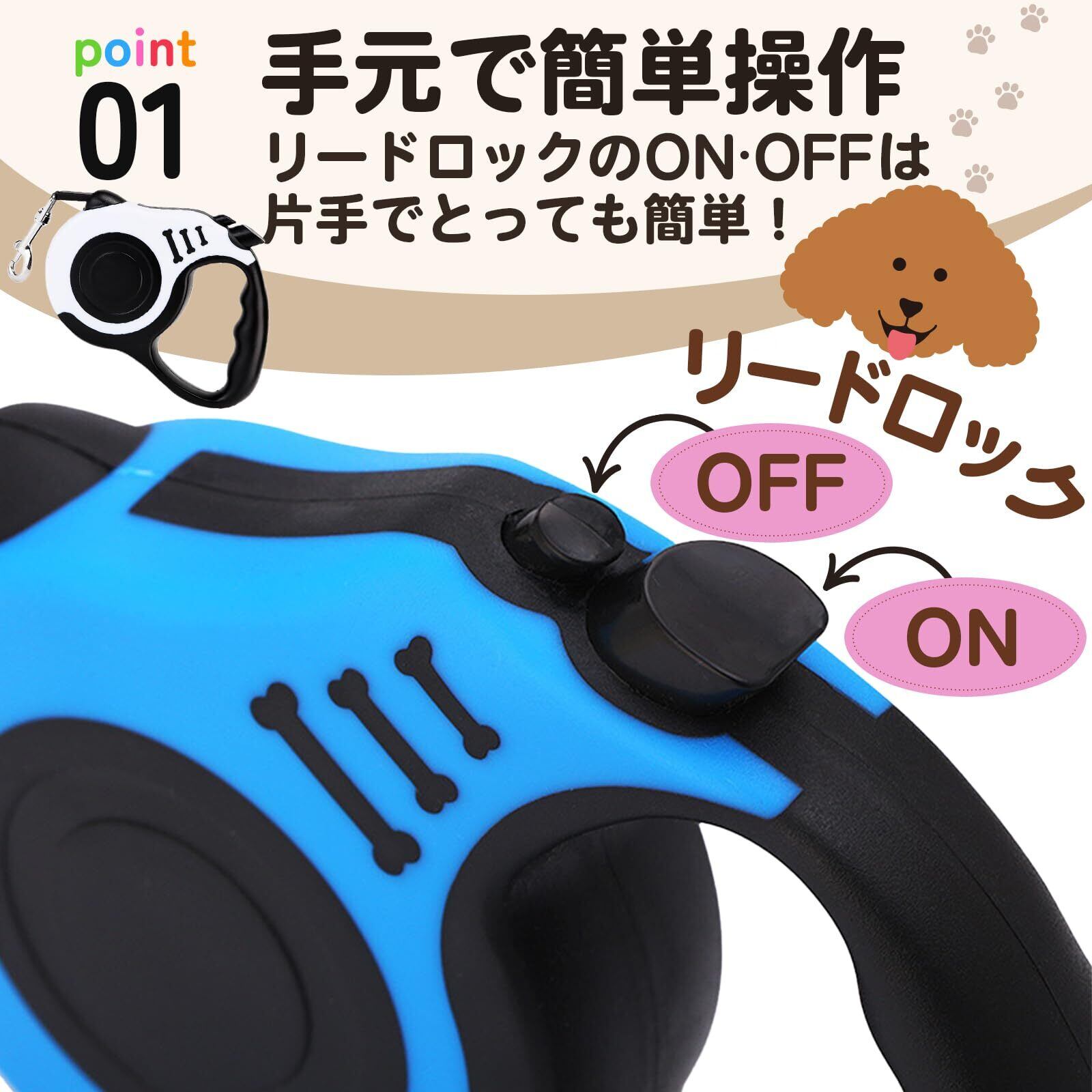 【操作簡単】親指でブレーキ&ロックが簡単に操作でき、最長5メートルまでリードが伸びられるので、場所に応じて、ご愛犬をコントロールしながら最大に自由にさせられます。