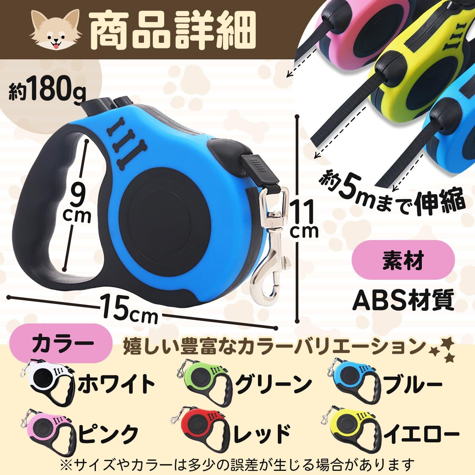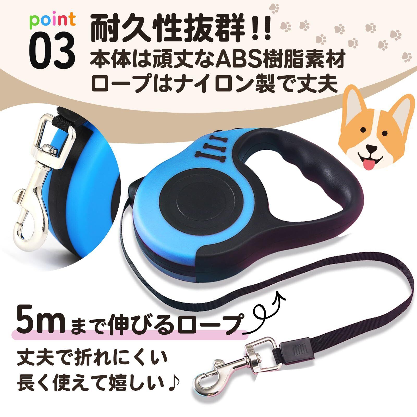 【5メートルの巻き取り式設計】最長5メートルまで引き伸ばせますので、範囲内にちゃんとご愛犬をコントロールすることができます。