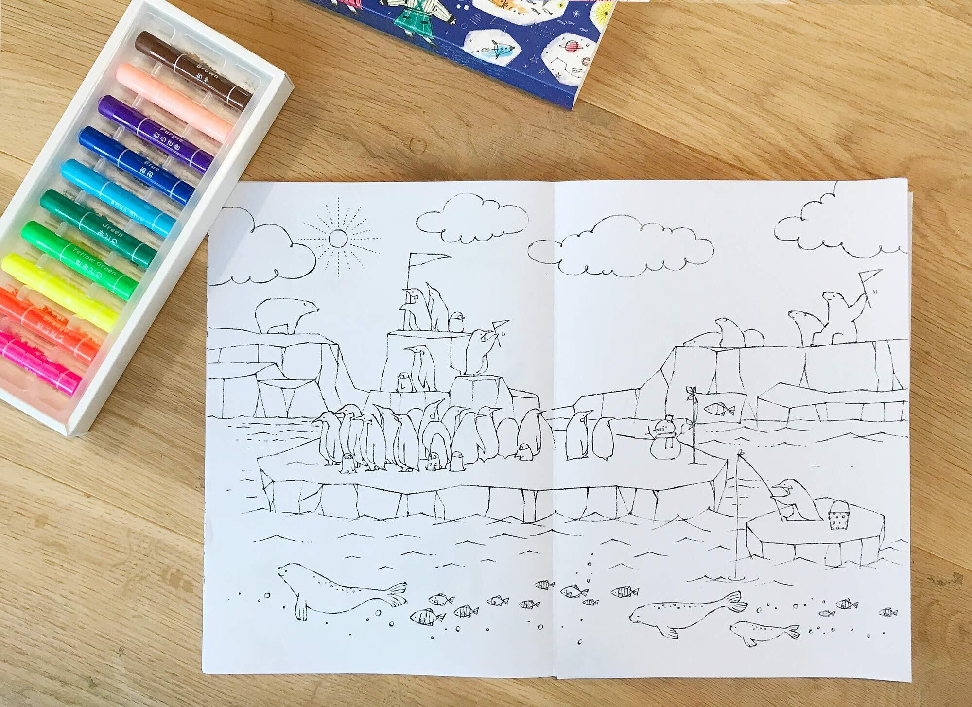中紙に厚手の画用紙を採用しており、クレヨンや色鉛筆のほか、水彩えのぐや水性ペンも使用可能です。