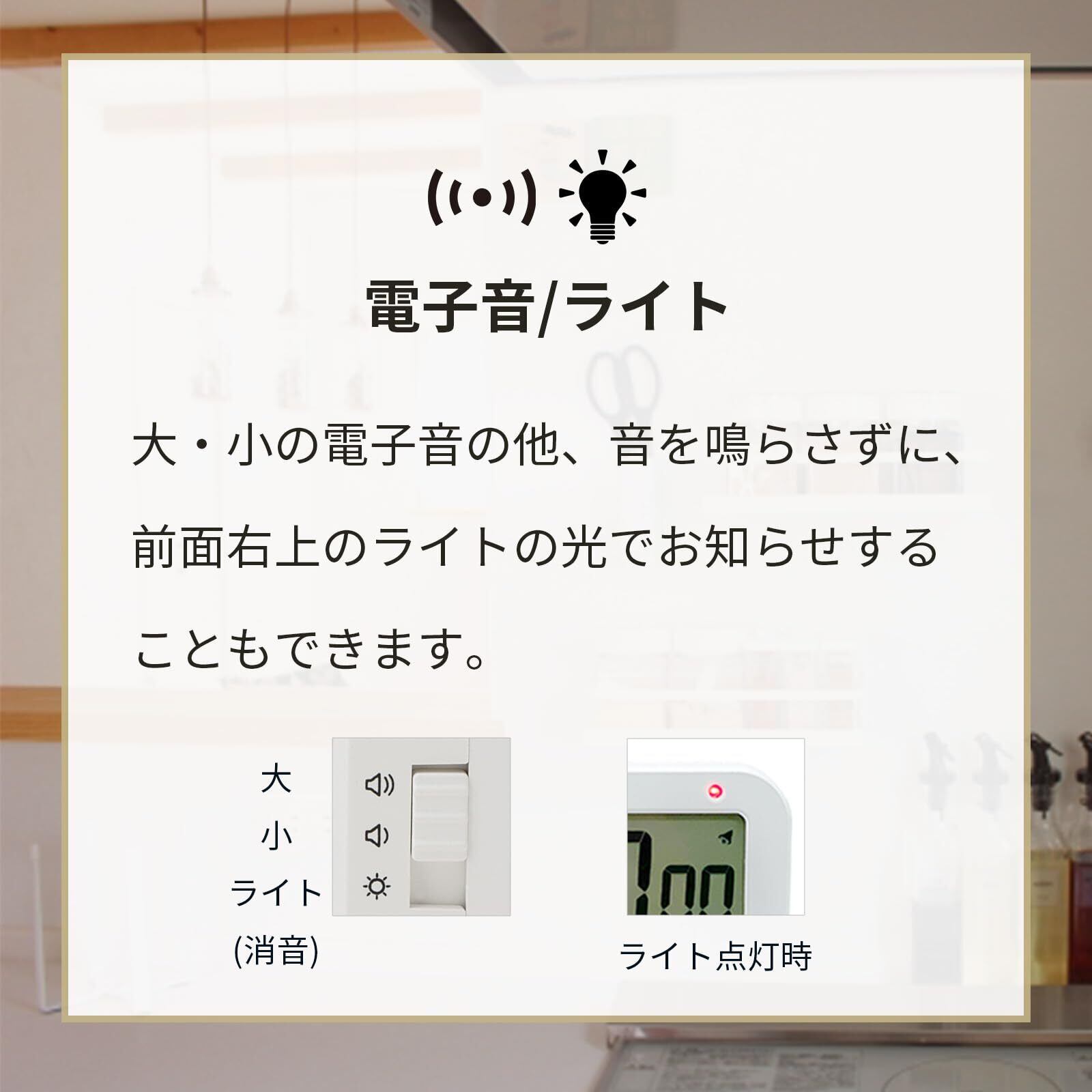 機能・仕様:カウントダウン(最大99時間59分59秒)、カウントアップ(最大99時間59分59秒)、タイマー音(音量大・音量小・消音(ライト)の3種類)、時計機能(12/24時間表示切替可)、電子音アラーム(音量大・音量小・消音(ライト)の3種類)、一時停止機能、リピート機能、置き掛け兼用(マグネット・フック穴・スタンド)