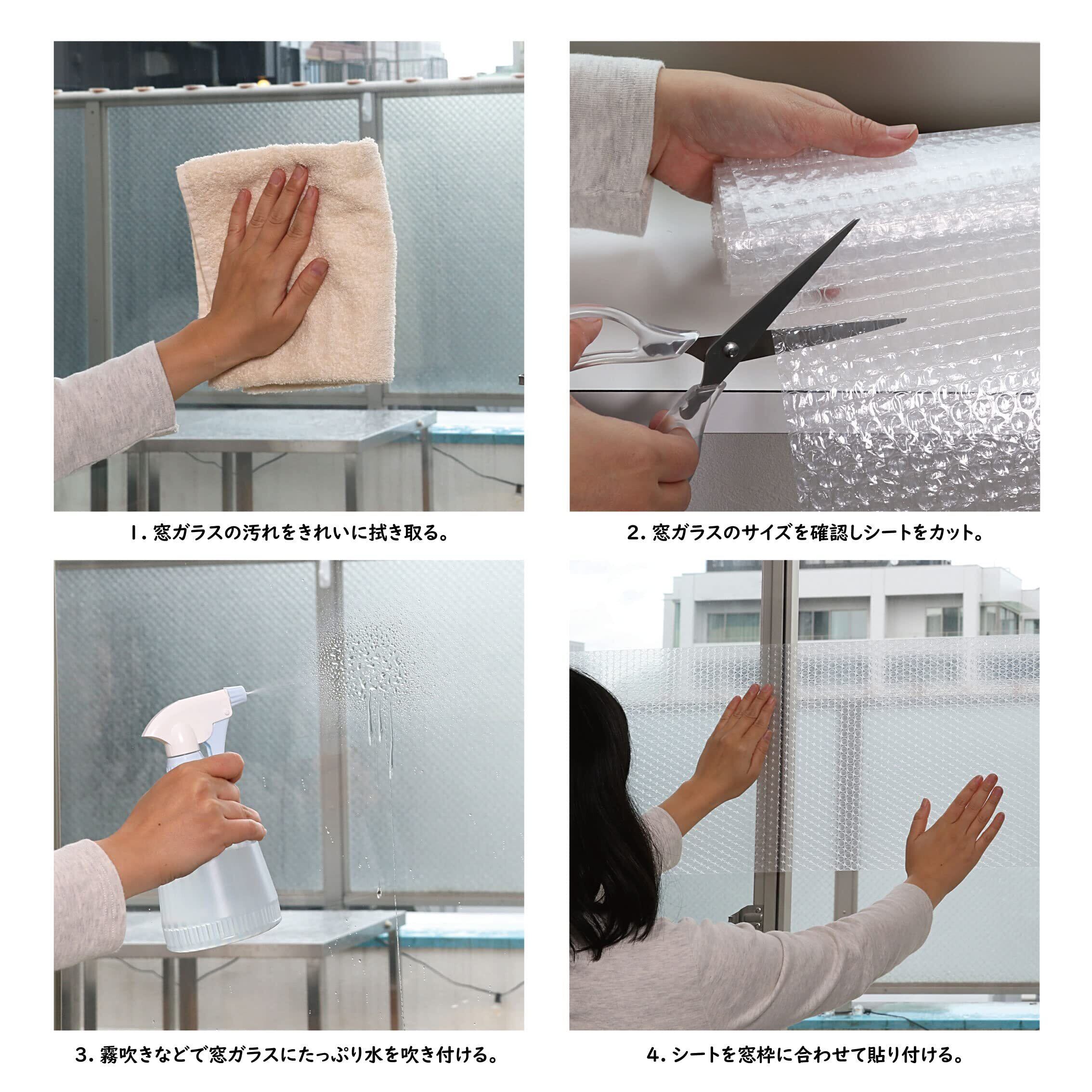 【水だけで貼れる断熱・結露防止シート】:水で窓ガラスに簡単に貼り付けできる断熱・結露防止シート。外観を損なわない柄ナシ。