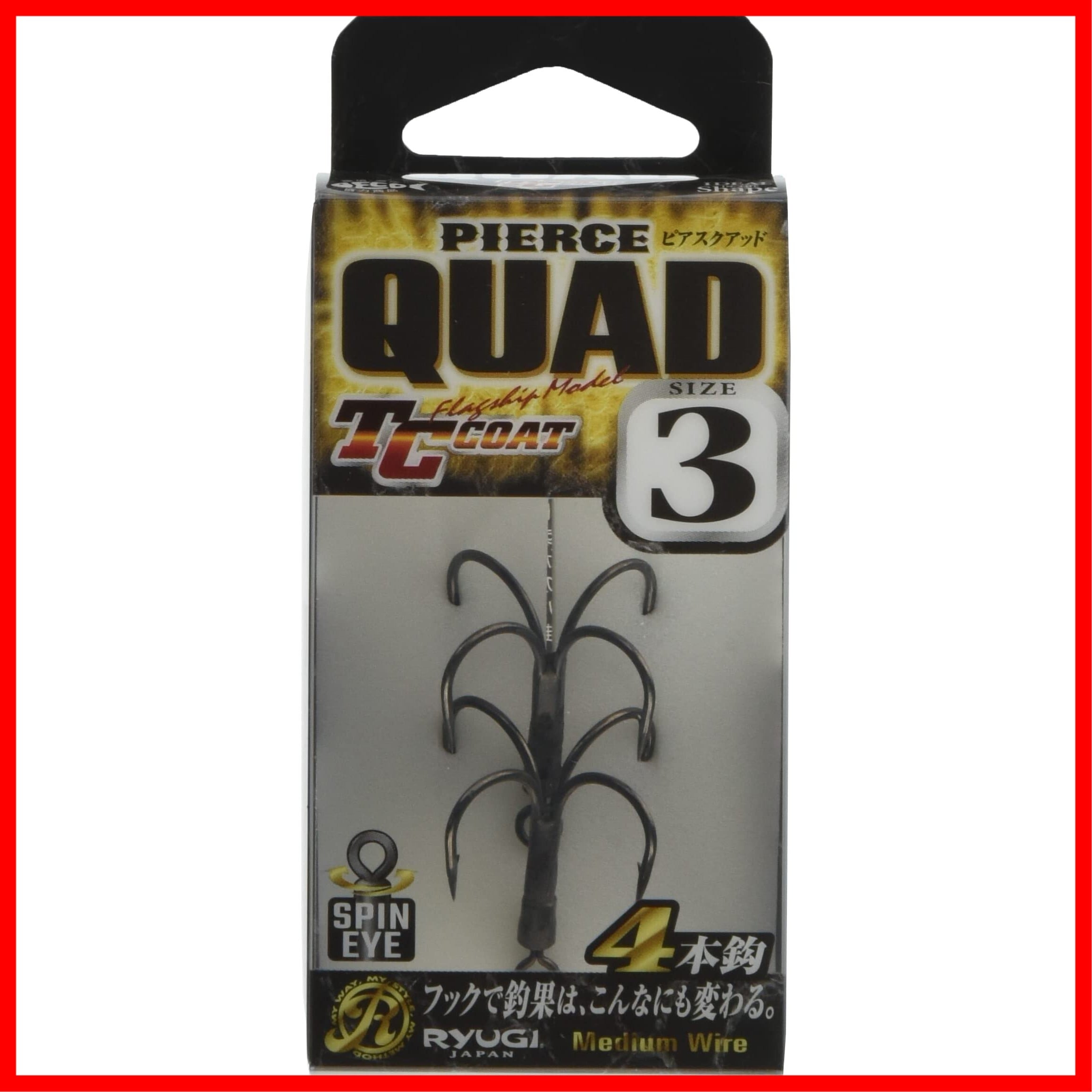 ピアストレブルの形状を受け継いだワイドゲイプ設計の4本鈎、ピアスクアッド。異次元の貫通力を生むTCコート。軸線径を細軸化することによりバイトを掛けることに特化した。掛けてからは360°回転追従するスピンアイでバレを抑制。"運"に泣かないための掛け重視という選択肢。