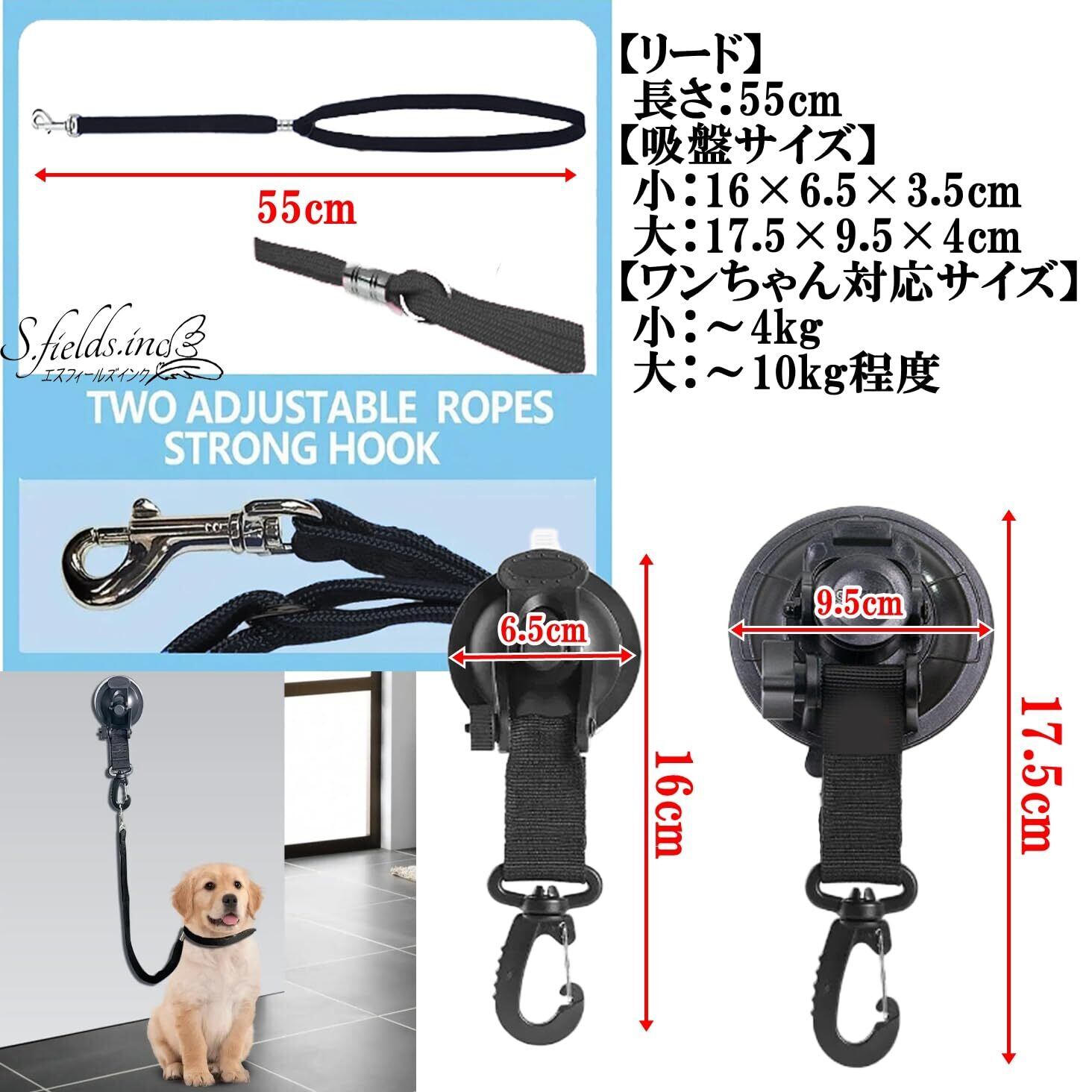 【リード】長さ:55cm 【吸盤サイズ】小:長さ16cm×幅6.5cm×高さ3.5cm 大:長さ17.5cm×幅9.5cm×高さ4cm 【ワンちゃん対応サイズ】小:~4kg 大:~10kg程度