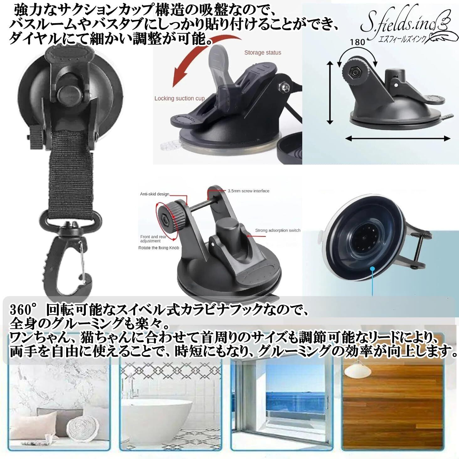 ワンちゃんのシャワーや入浴時にお使いいただける吸盤付きグルーミングリードです。小型犬用と中・大型犬用の大小2つの吸盤サイズからお選びいただけます。