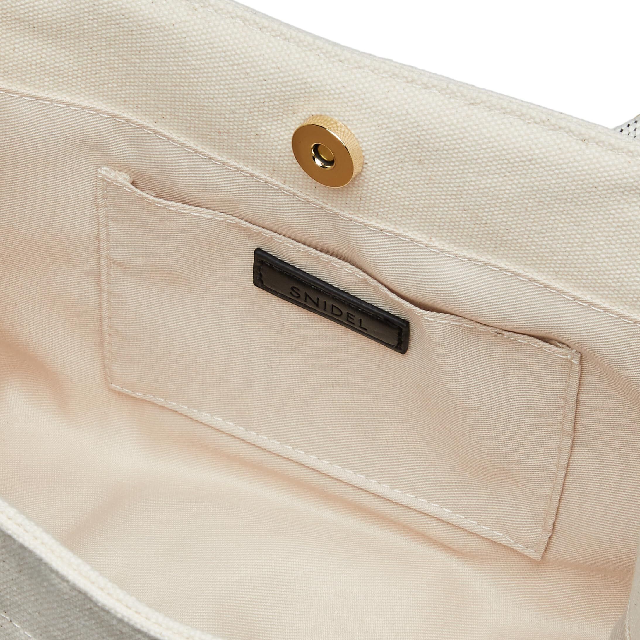 大人気の「SNIDEL」ロゴ刺繍入りバンブーバッグが夏素材で新登場。テープの素材と配色にシーズンムードをプラスしてアップグレードしました。付属のストラップを装着すればショルダーにもできる便利な2WAYデザイン。シーズンスタイルにぴったりなアイボリー、ベージュ、ライトピンクの3色をご用意しました。