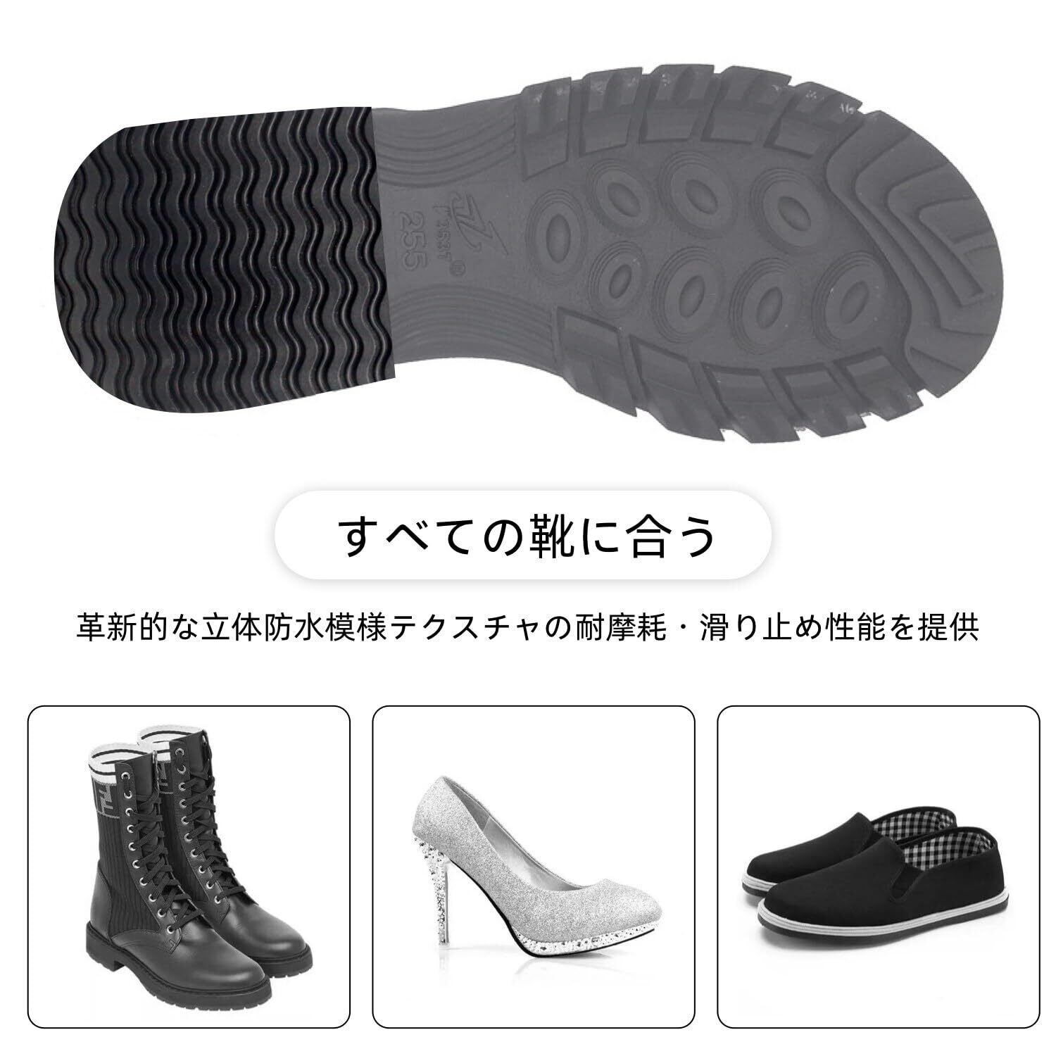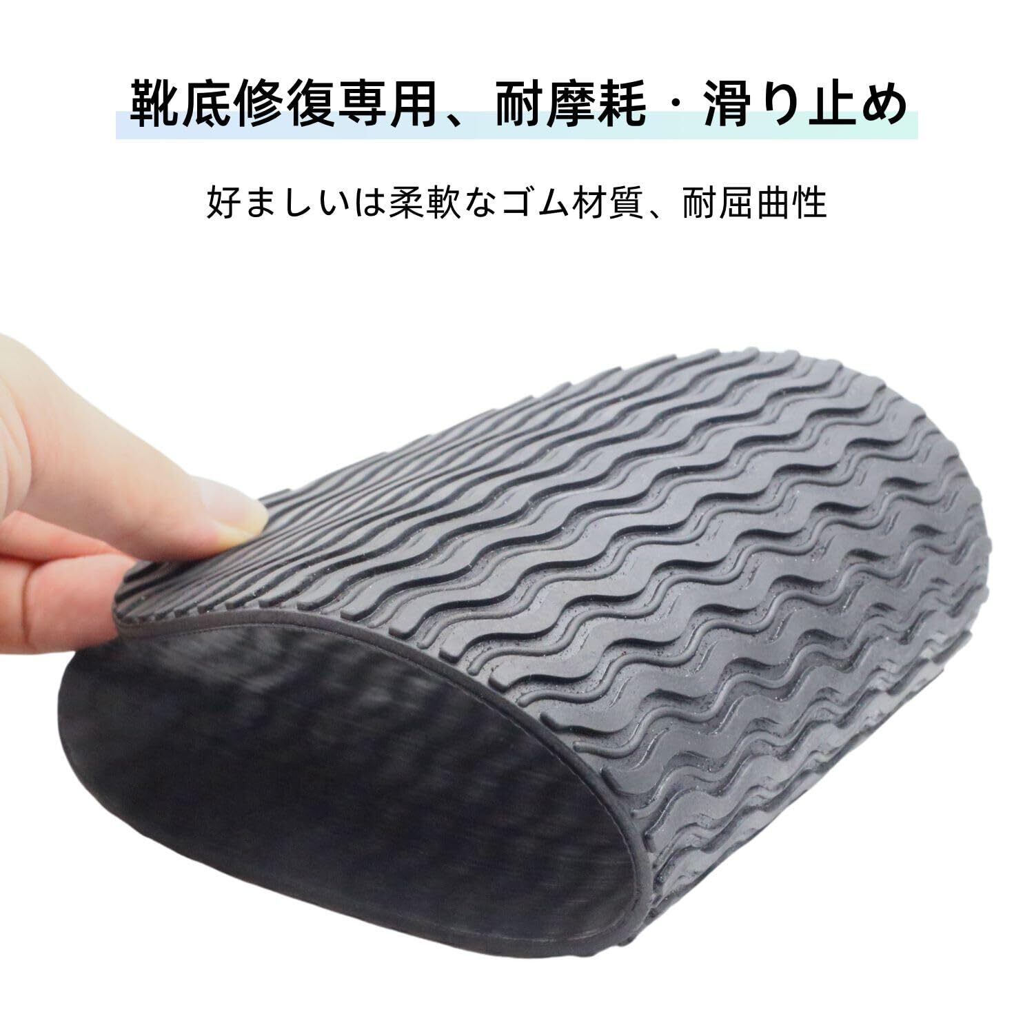 【高品質ゴム素材】耐久性の高い合成ゴムを使用し、自由にカットできる仕様で、さまざまな靴底にぴったりフィットします。必要な形状にカットして貼り付けるだけで簡単に使用できます。