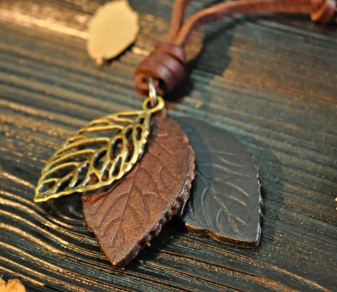 メタル、レザーを使ったカジュアルな木の葉モチーフペンダントのご紹介です。カラーはダークブラウン