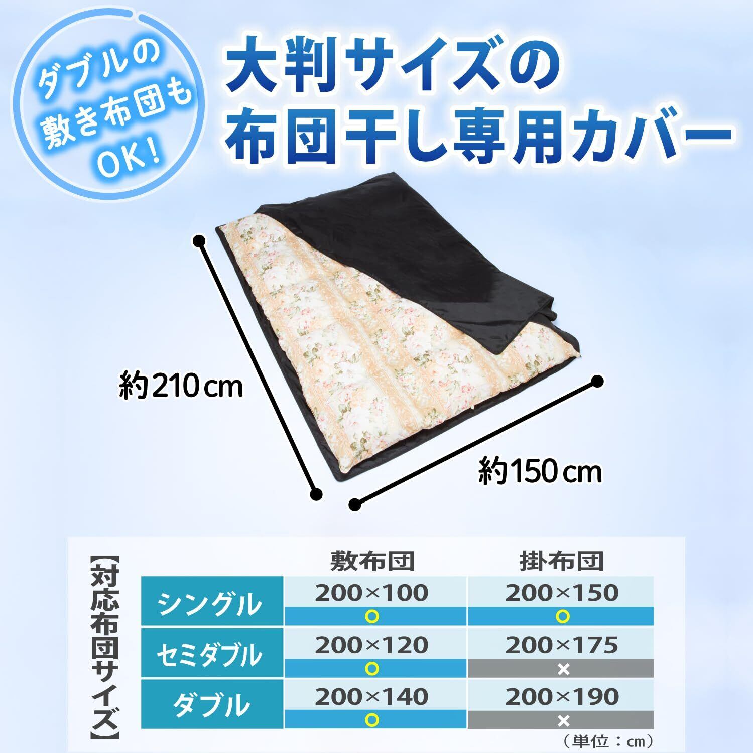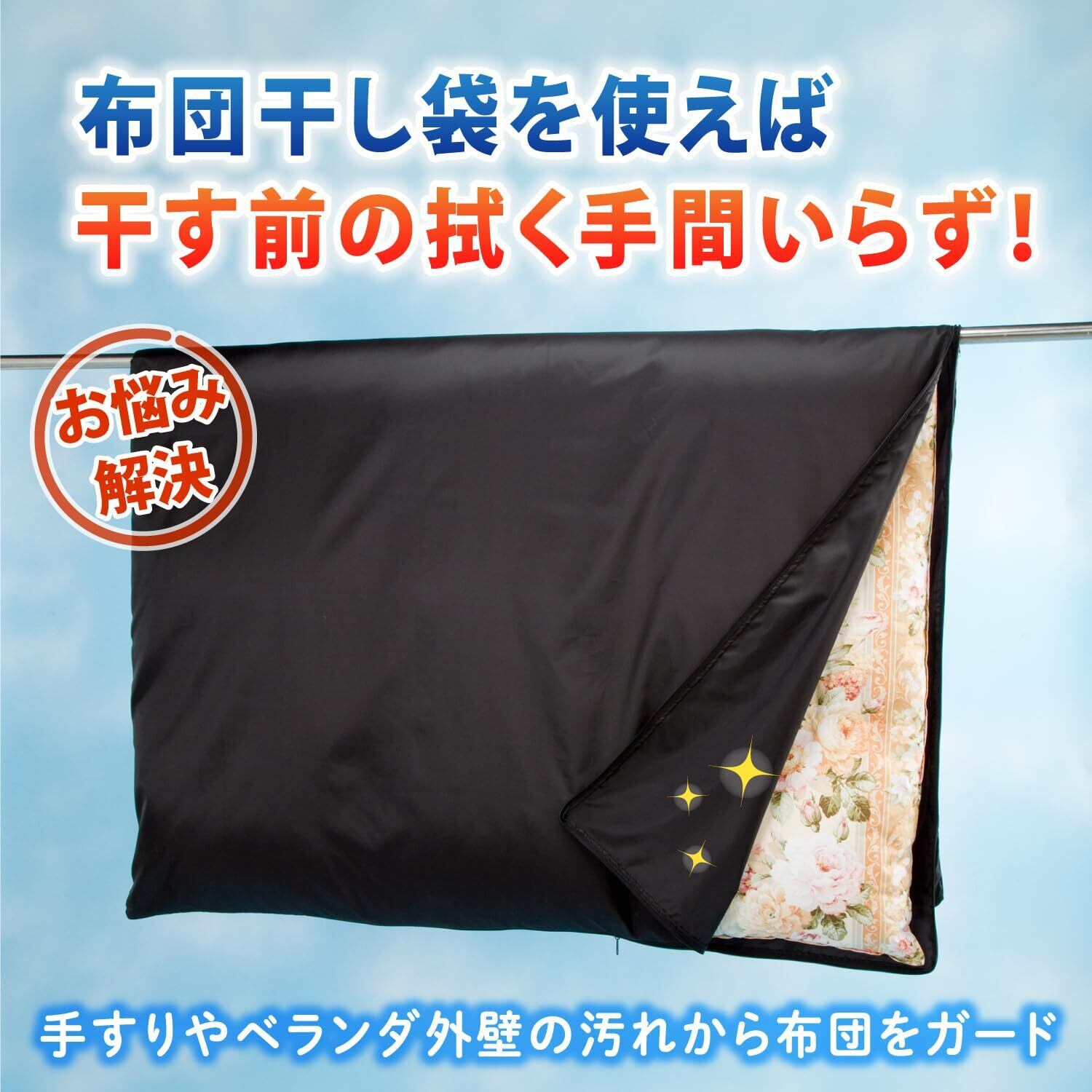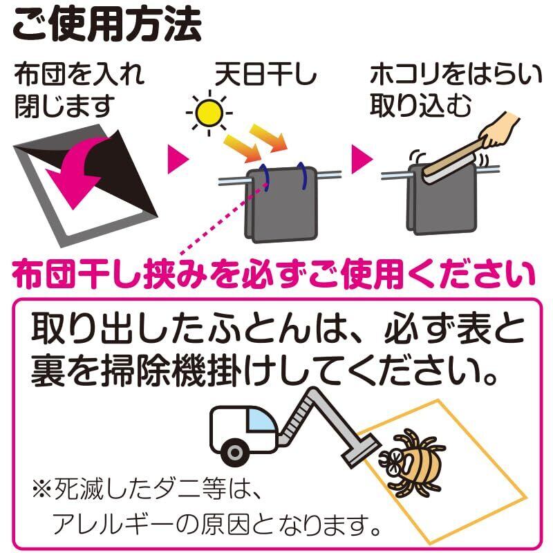 【ホコリや花粉・黄砂・鳥のフンなどから布団を守る】:袋に入れて干すのでホコリや花粉、黄砂、鳥のフンなどから布団を守る。L字ダブルジップファスナーで、大きく開くので布団の出し入れがスムーズ。