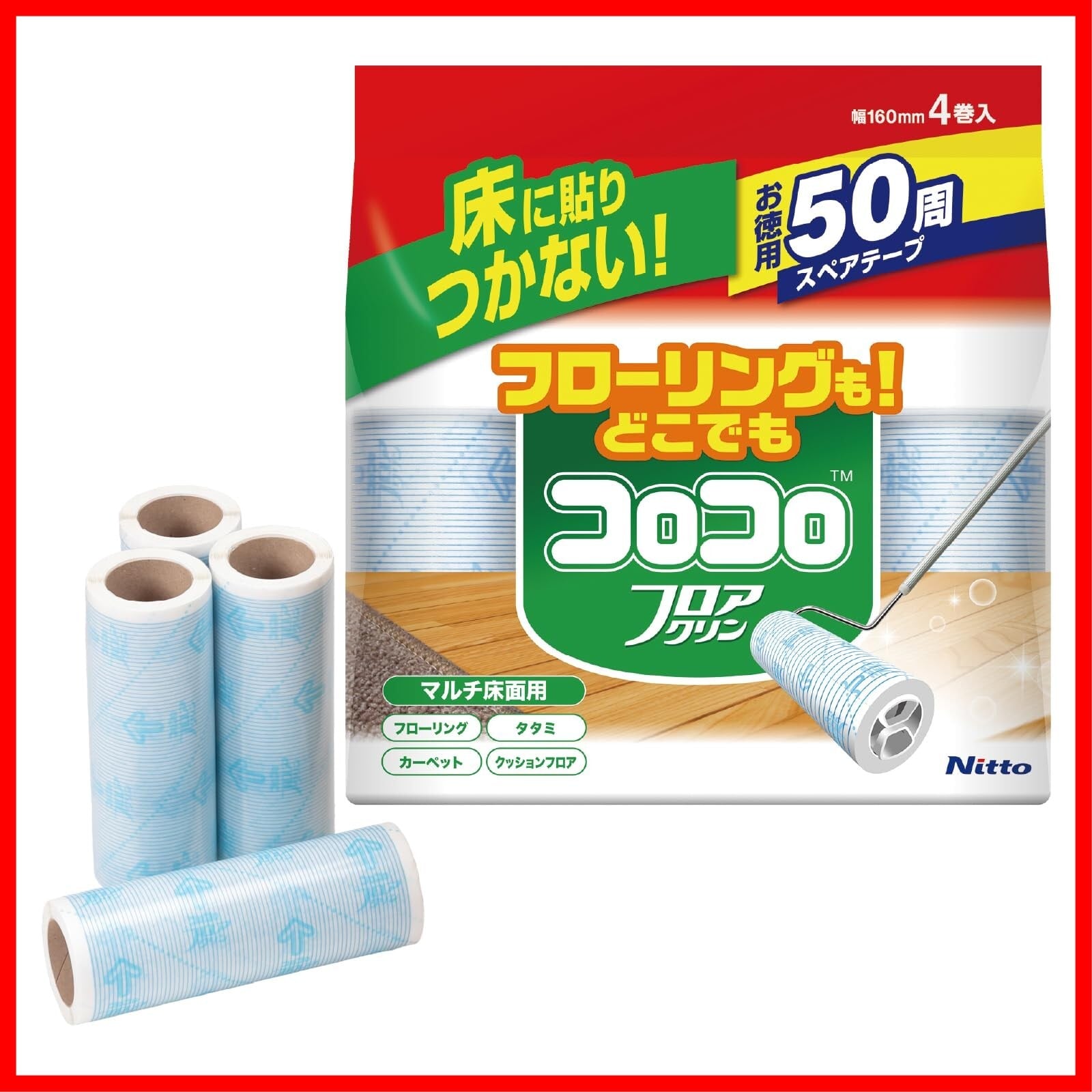 ニトムズ コロコロ スペアテープ 50周 4巻入 160mm幅 フロアクリン テープ 替え フローリング カーペット 畳 元祖 ペットの毛 ダニ 花粉 お徳用 CC0014