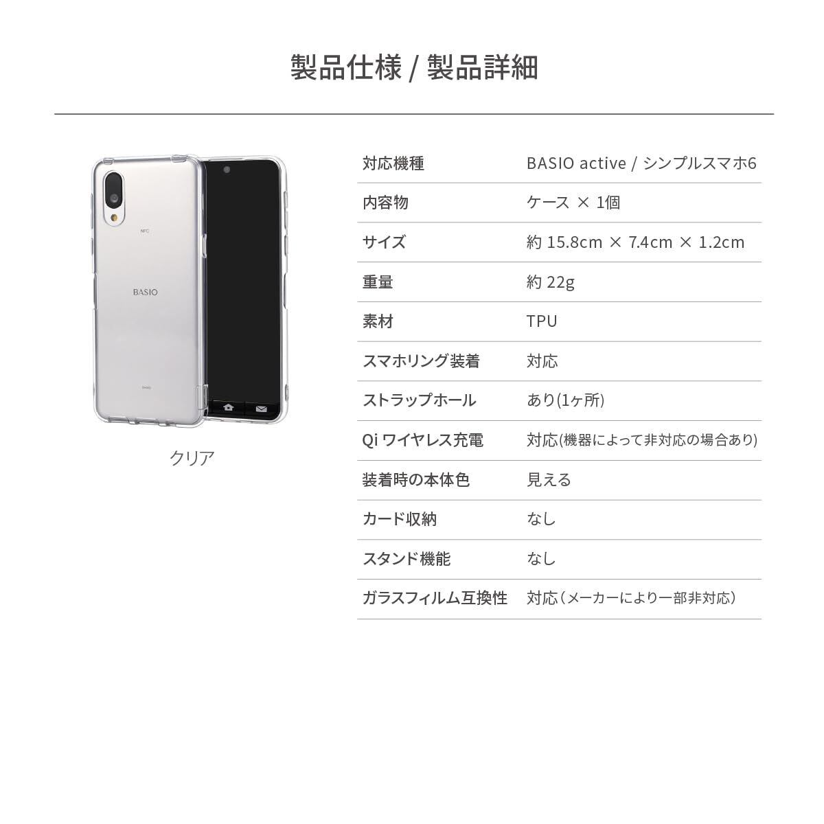 【製品仕様】… ◆ 対応機種 : BASIO active ベイシオ アクティブ2 ( SHG12 ) / アクティブ ( SHG09 ) / シンプルスマホ 6 ( A201SH ) / シンプルスマホ 7 ◆ 内容物 : ケース × 1個 ◆ サイズ : 約 15.8cm × 7.4cm × 1.2cm ◆ 重量 : 約 22g ◆ 素材 : TPU