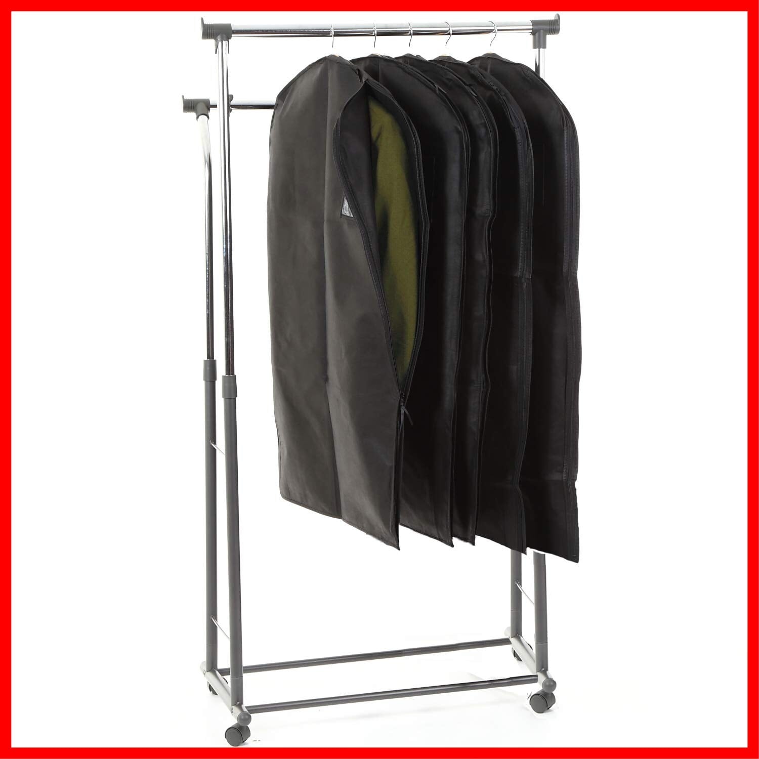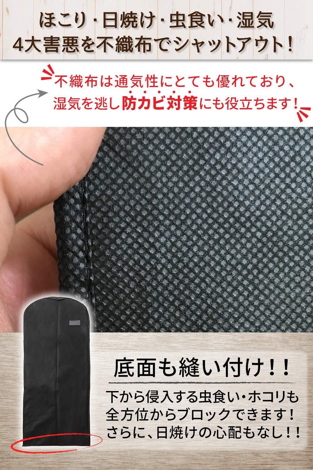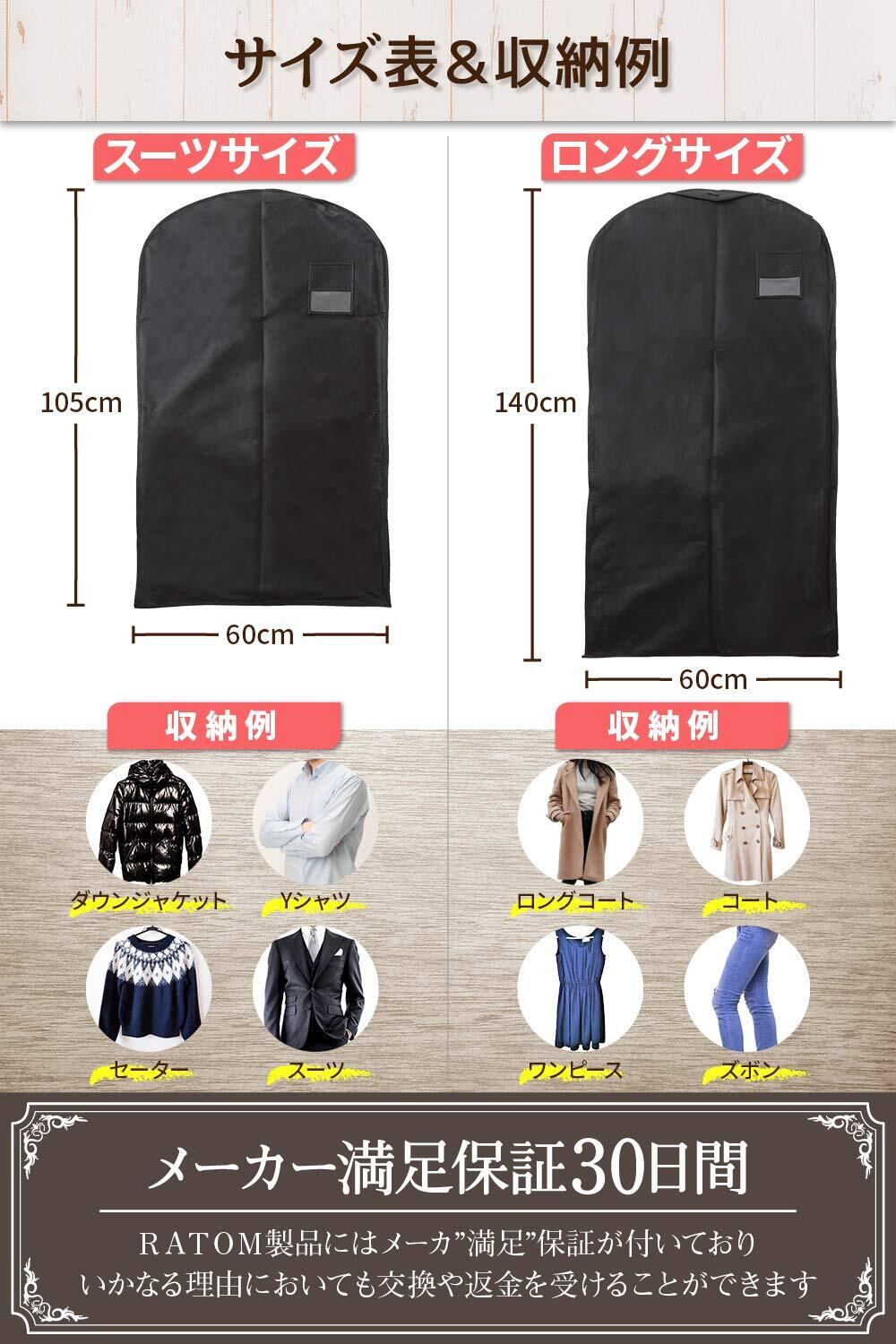【どのサイズを選べばいいの?】ご自身の収納予定の衣類によってご購入するタイプをお選びください。「スーツサイズ5枚セット」は、縦105×横60cmですので、スーツやジャケット等の丈の短い衣類に適しております。「ロング5枚セット」は、縦140×横60cmですので、ロングコートやワンピース等の丈の長い衣類に適しております。