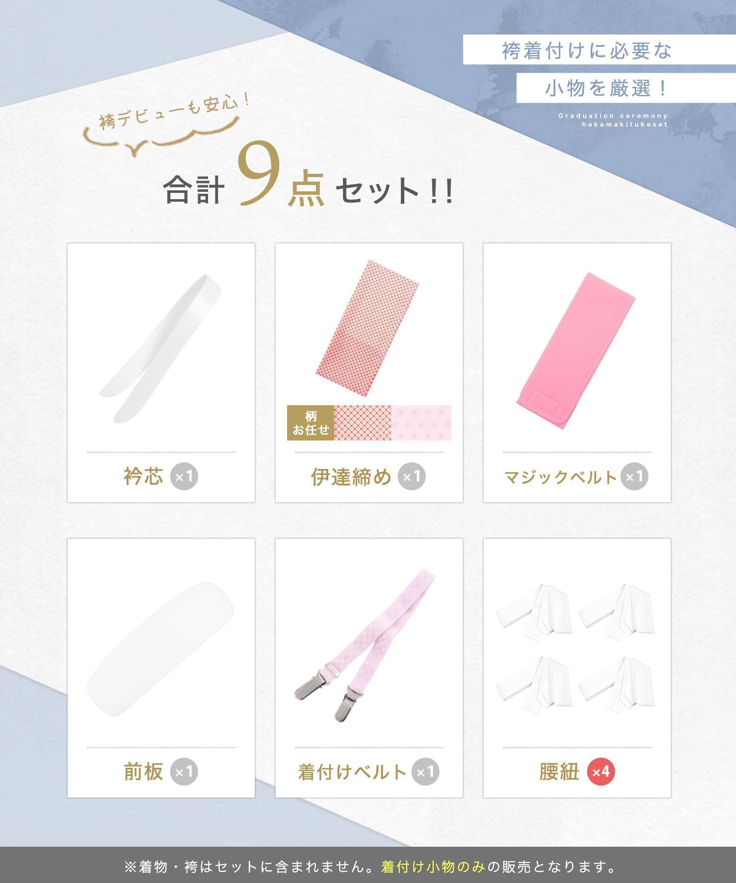 卒業式で袴を着たいけれど、何を揃えたら良いかわからないという和装初心者の方にもおすすめ!便利な9点小物セットです。